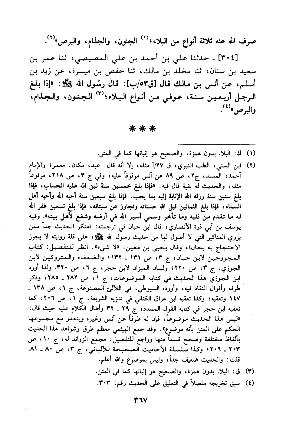 304- حَدَّثَنا علي بن أحمد بن علي المصيصي، حَدَّثَنا عُمَر بن سعيد بن سنان، حَدَّثَنا مخلد بن مالك، حَدَّثَنا حفص بن ميسرة، عَن زيد بن أسلم، عَن أنس بن مالك، قال: قال رسول الله صَلَّى الله عَليْهِ وَسلَّم: إذا بلغ الرجل أربعين سنة عوفي من أنواع البلاء الجنون والجذام والبرص.