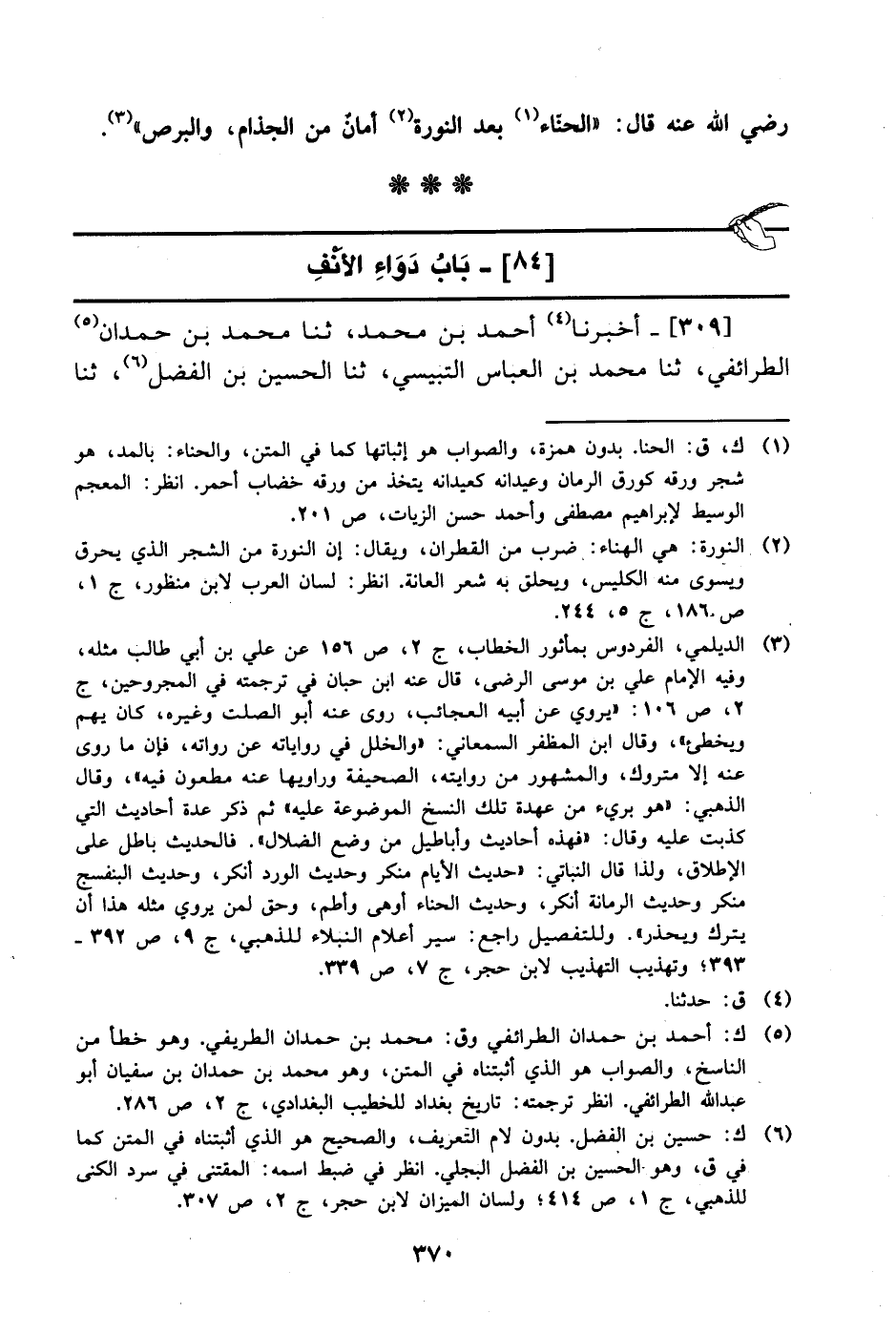 309- أخبرنا أحمد بن محمد، حَدَّثَنا محمد بن حمدان الطرائفي، حَدَّثَنا محمد بن العباس التبيسي، حَدَّثَنا الحسين بن الفضل، حَدَّثَنا -[371]- الحسين بن علوان الكلبي، عَن حَرِيزِ بْنِ عُثْمَانَ، عَن عَبد الله بن بشر المازني، عَن النبي صَلَّى الله عَليْهِ وَسلَّم أنه: لا تنتفوا الشعر الذي يكون في الأنف فإنه يورث الأكلة ولكن قصوه قصا.