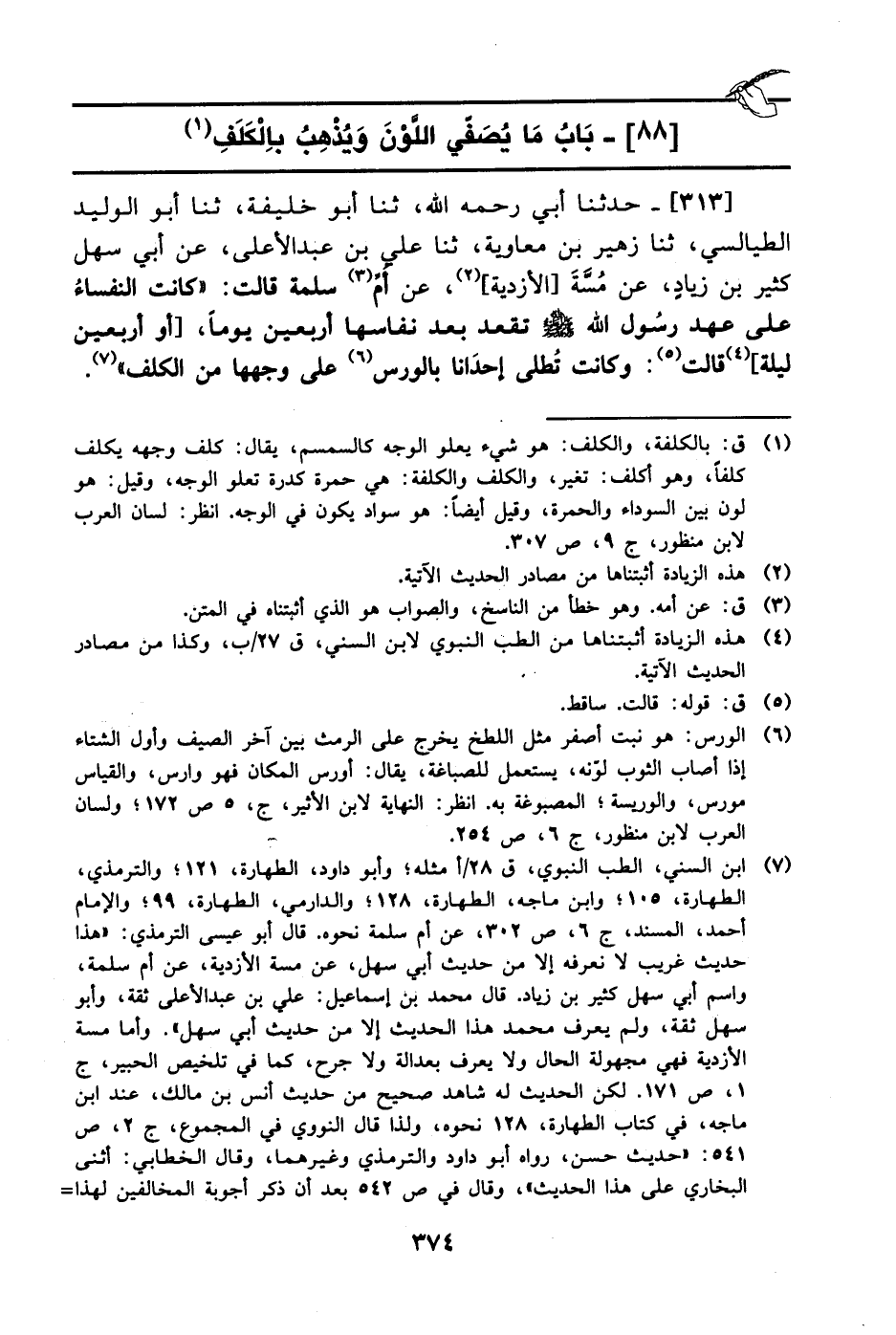 313- حَدَّثَنا أبي رحمه الله، حَدَّثَنا أبو خليفة، حَدَّثَنا أبو الوليد الطيالسي، حَدَّثَنا زهير بن معاوية، حَدَّثَنا علي بن عبد الأعلى، عَن أَبِي سهل كثير بن زياد، عَن مسة الأزدية، عَن أم سلمة قالت: كانت النفساء على عهد رسول الله صَلَّى الله عَليْهِ وَسلَّم تقعد بعد نفاسها أربعين يوما، أَو أربعين ليلة قالت: وكانت تطلى إحدانا بالورس على وجهها من الكلف.