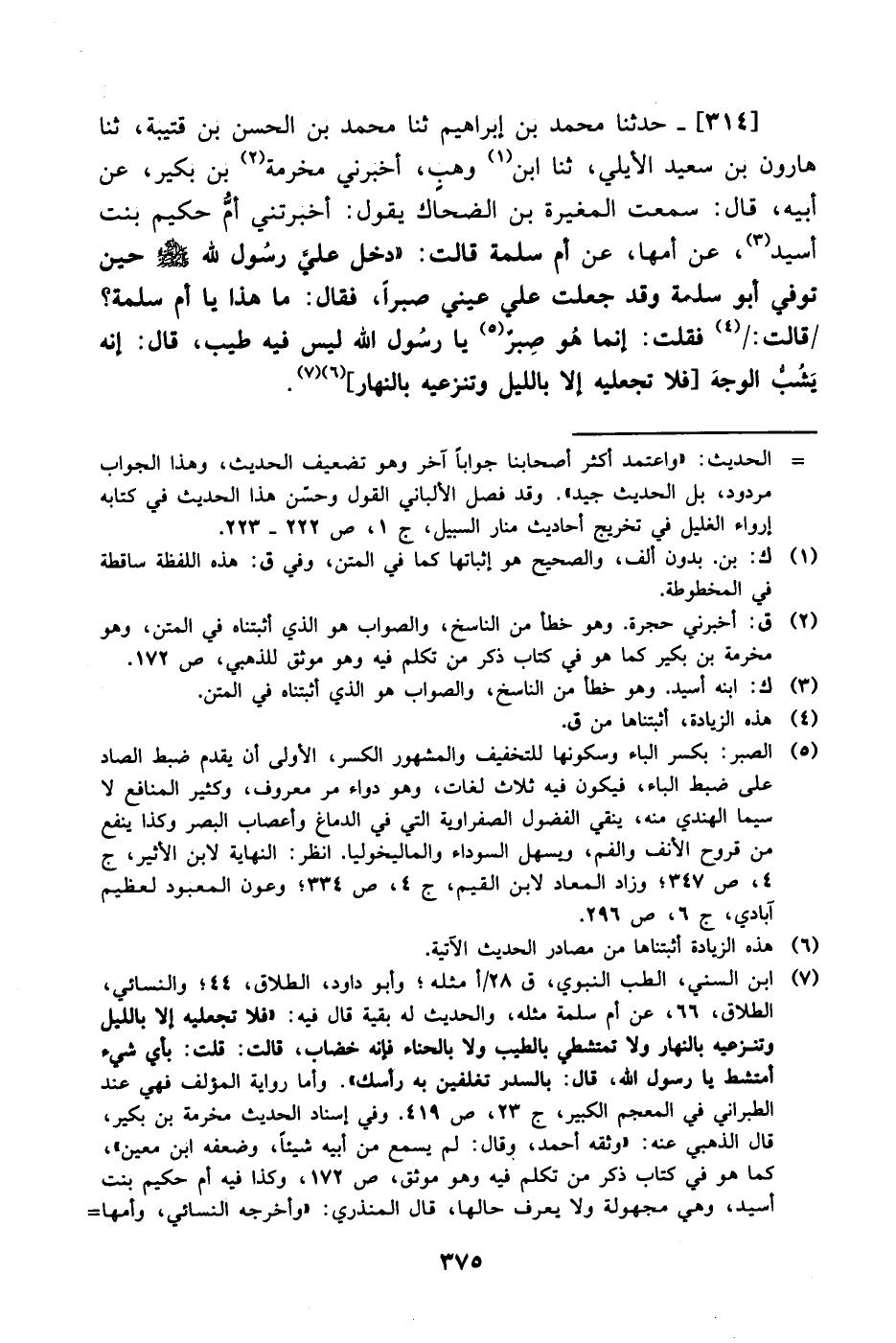 314- حَدَّثَنا محمد بن إبراهيم، حَدَّثَنا محمد بن الحسن بن قتيبة، حَدَّثَنا هارون بن سعيد الأيلي، حَدَّثَنا ابن وهب أخبرني مخرمة بن بكير، عَن أبيه قال: سمعت المغيرة بن الضحاك يقول: أخبرتني أم حكيم بنت أسيد، عَن أمها، عَن أم سلمة قالت: دخل علي رسول الله صَلَّى الله عَليْهِ وَسلَّم حين توفي أبو سلمة وقد جعلت على عيني صبرا فقال: ما هذا ياأم سلمة؟ قالت: فقلت: إنما هو صبر يا رسول الله ليس فيه طيب قال: إنه يشب الوجه فلا تجعليه إلا بالليل وتنزعيه بالنهار.