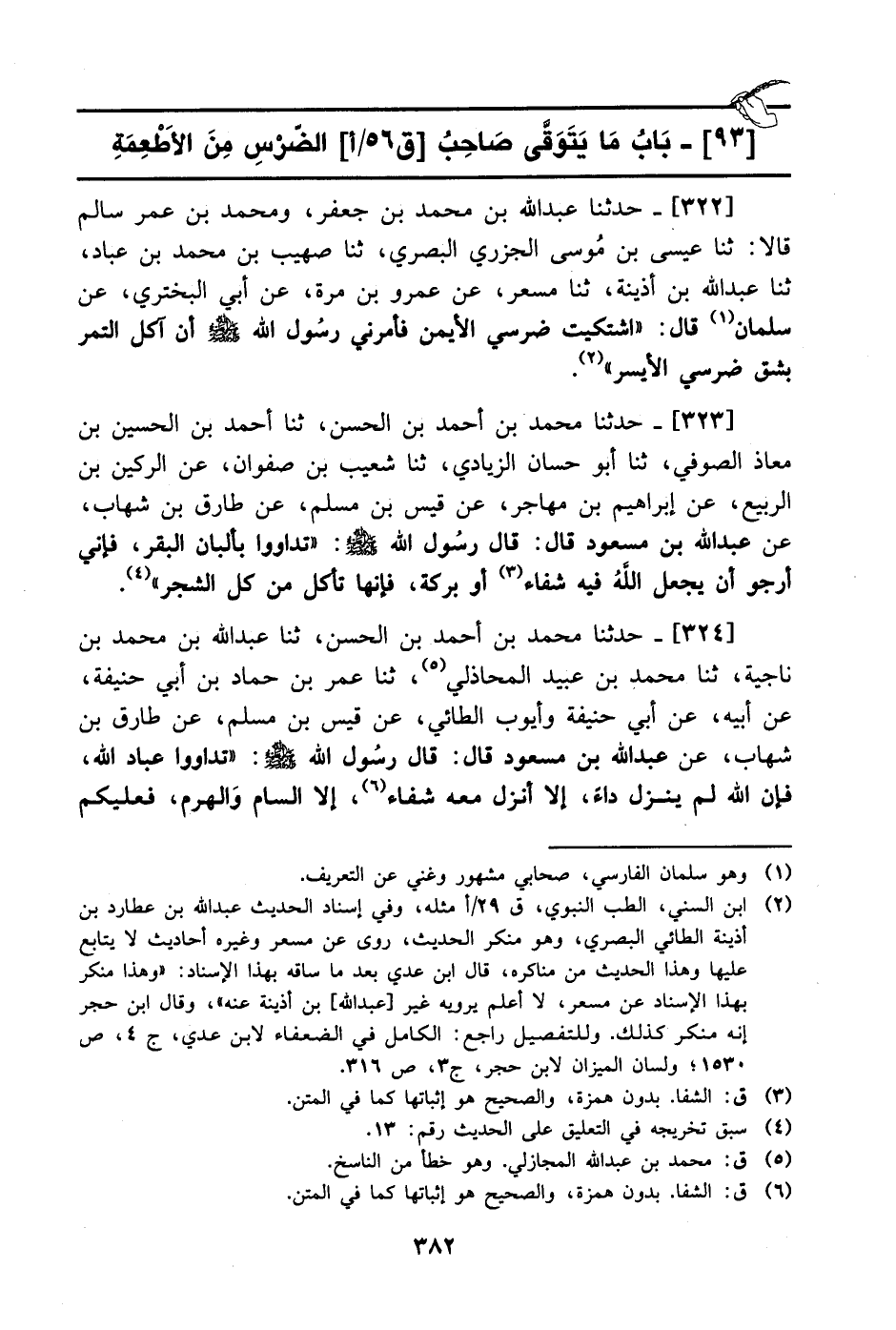 324- حَدَّثَنا محمد بن أحمد بن الحسن، حَدَّثَنا عبد الله بن محمد بن ناجية، حَدَّثَنا محمد بن عبيد المحاذلي، حَدَّثَنا عُمَر بن حماد بن أبي حنيفة، عَن أبيه، عَن أبيه حنيفة وأيوب الطائي، عَن قيس بن مسلم، عَن طارق بن شهاب، عَن عَبد الله بن مسعود، قال: قال رسول الله صَلَّى الله عَليْهِ وَسلَّم: تداووا عباد الله فإن الله لم ينزل داء إلا أنزل معه شفاء إلا السام والهرم فعليكم -[383]- بألبان البقر فإنها تحيط من كل الشجر.