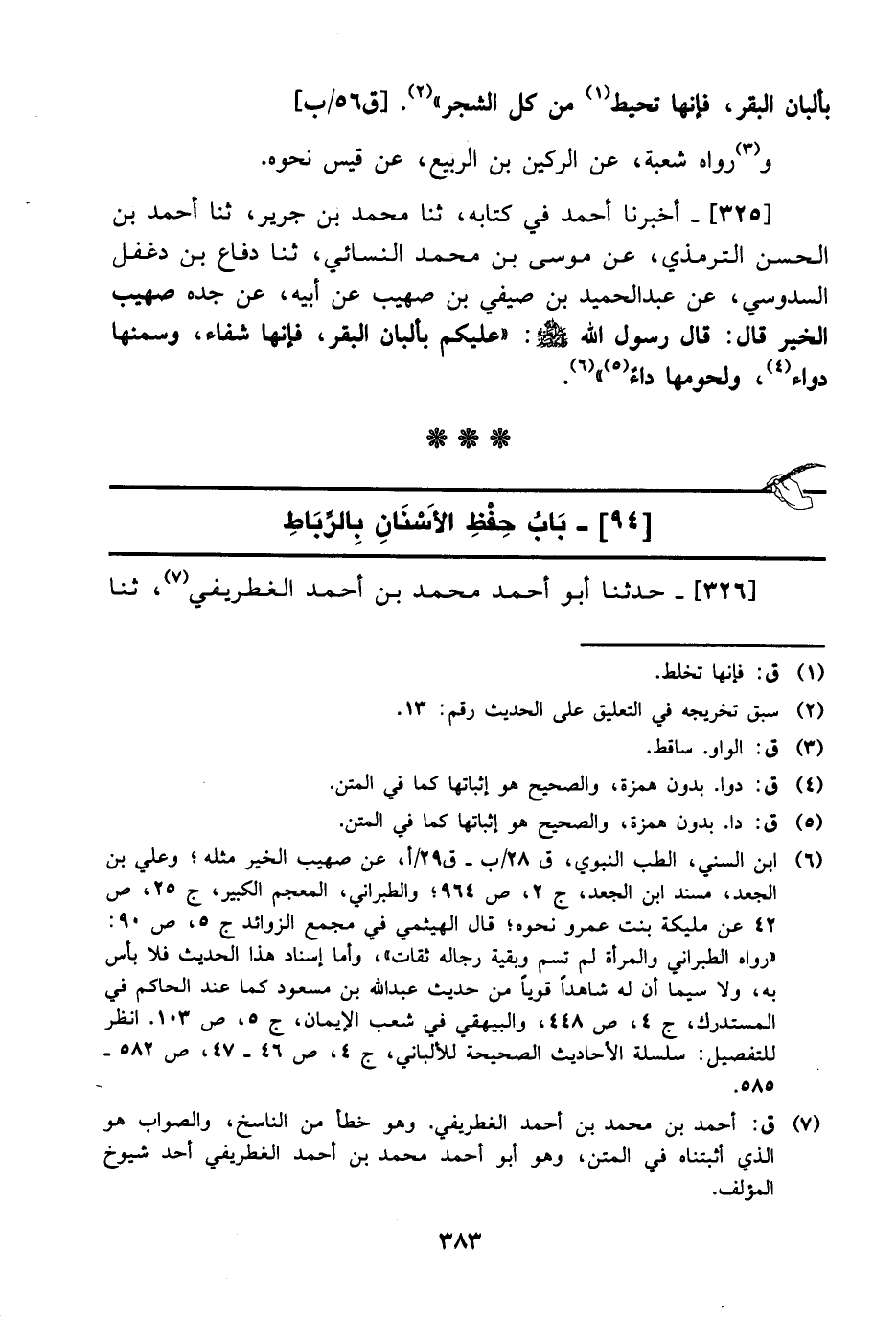 325- أخبرنا أحمد في كتابه، حَدَّثَنا محمد بن جرير، حَدَّثَنا أحمد بن الحسن الترمذي، عَن موسى بن محمد النسائي، حَدَّثَنا دفاع بن دغفل السدوسي، عَن عَبد الحميد بن صيفي بن صهيب، عَن أبيه، عَن جَدِّه صهيب الخير، قال: قال رسول الله صَلَّى الله عَليْهِ وَسلَّم: عليكم بألبان البقر فإنها شفاء وسمنها دواء ولحومها داء.