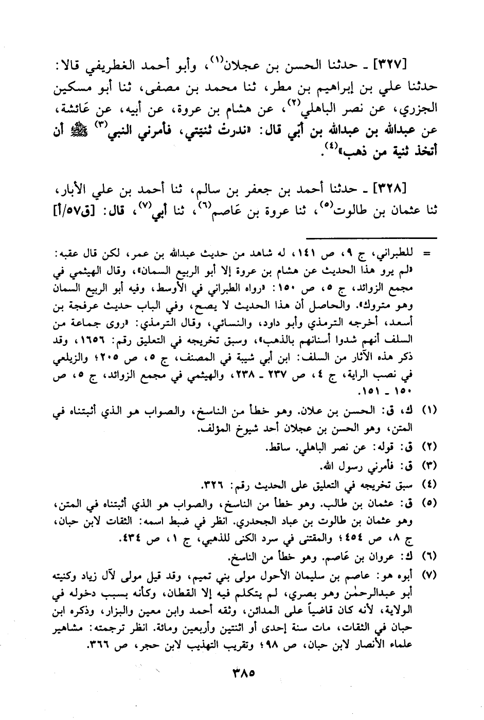 327- حَدَّثَنا الحسن بن عجلان وأبو أحمد الغطريفي قالا: حَدَّثَنا علي بن إبراهيم بن مطر، حَدَّثَنا محمد بن مصفى، حَدَّثَنا أبو مسكين الجزري، عَن نصر الباهلي، عَن هشام بن عروة، عَن أبيه، عَن عائشة، عَن عَبد الله بن عبد الله بن أبي قال: ندرت ثنيتي فأمرني النبي صَلَّى الله عَليْهِ وَسلَّم أن أتخذ ثنية من ذهب.