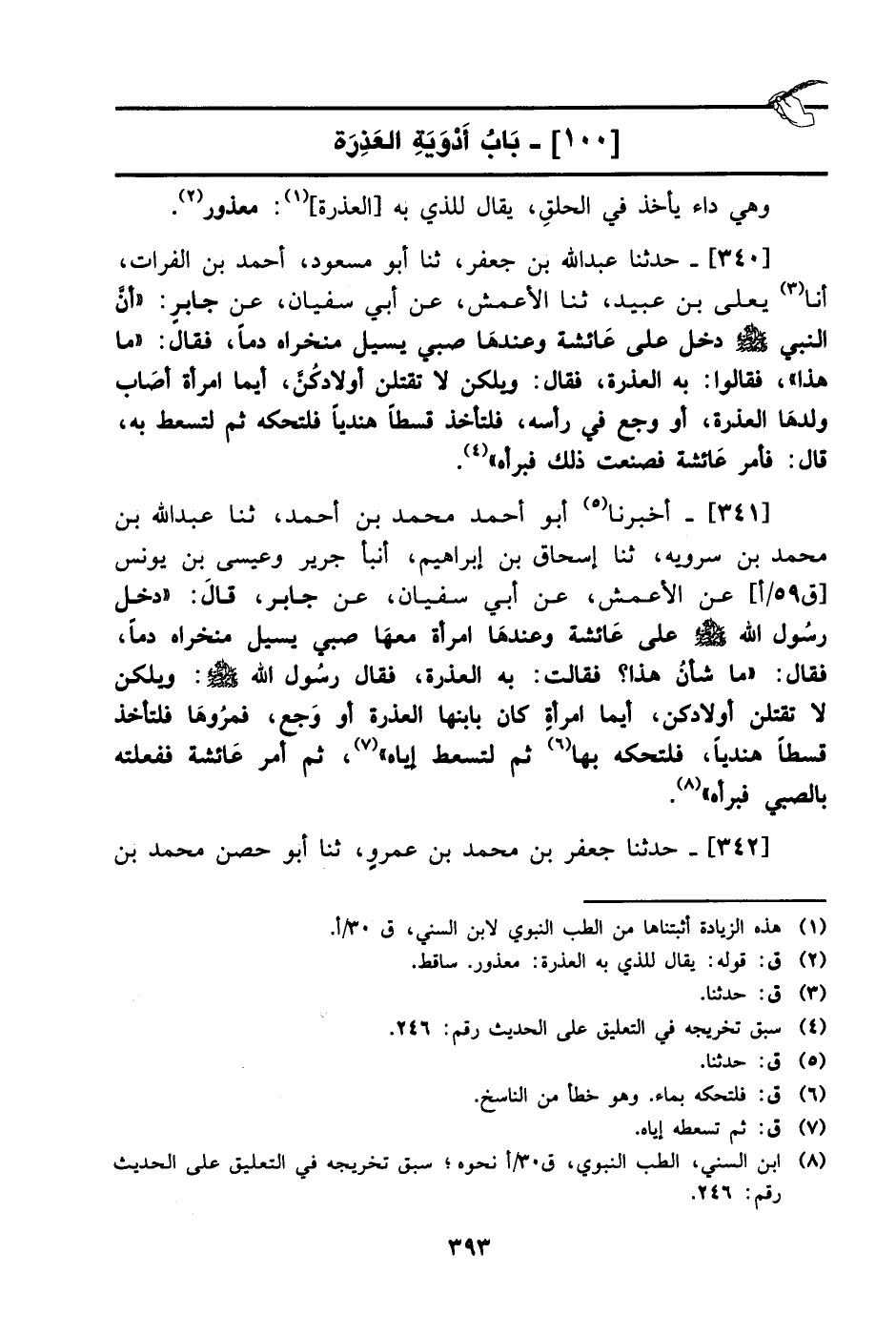 340- حَدَّثَنا عبد الله بن جعفر، حَدَّثَنا أبو مسعود أحمد بن الفرات، أَخْبَرنا يعلى بن عبيد، حَدَّثَنا الأعمش، عَن أَبِي سفيان، عَن جابر: أن النبي صَلَّى الله عَليْهِ وَسلَّم دخل على عائشة وعندها صبي يسيل منخراه دما فقال: ما هذا فقالوا: به العذرة فقال: ويلكن لا تقتلن أولادكن أيما امرأة أصاب ولدها العذرة، أَو وجع في رأسه فلتأخذ قسطا هنديا فلتحكه ثم لتسعط به قال: فأمر عائشة فصنعت ذلك فبرأه.