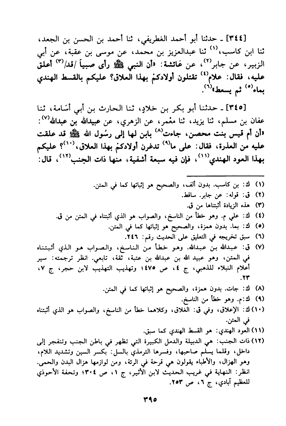 344- حَدَّثَنا أبو أحمد الغطريفي، حَدَّثَنا أحمد بن الحسن بن الجعد، حَدَّثَنا ابن كاسب، حَدَّثَنا عبد العزيز بن محمد، عَن موسى بن عقبة، عَن أَبِي الزبير، عَن جابر، عَن عائشة: أن النبي صَلَّى الله عَليْهِ وَسلَّم رأى صبيا قد أعلق عليه فقال: علام تقتلون أولادكم بهذا العلاق؟ عليكم بالقسط الهندي بماء ثم يسعط.