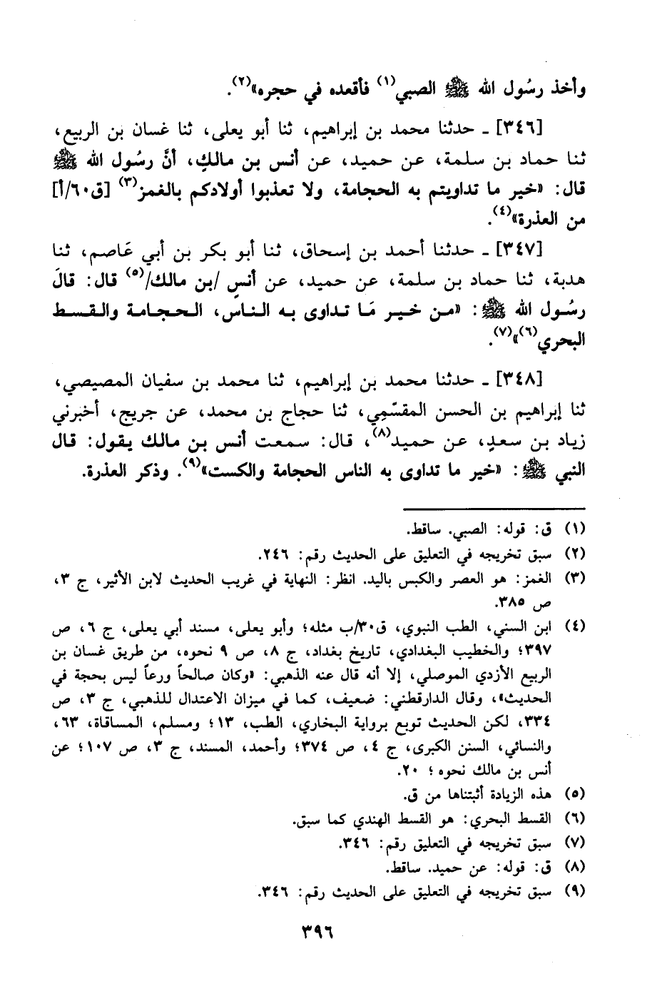 347- حَدَّثَنا أحمد بن إسحاق، حَدَّثَنا أبو بكر بن أبي عاصم، حَدَّثَنا هدبة، حَدَّثَنا حماد بن سلمة، عَن حميد، عَن أنس بن مالك، قال: قال رسول الله صَلَّى الله عَليْهِ وَسلَّم: من خير ما تداوى به الناس الحجامة والقسط البحري.