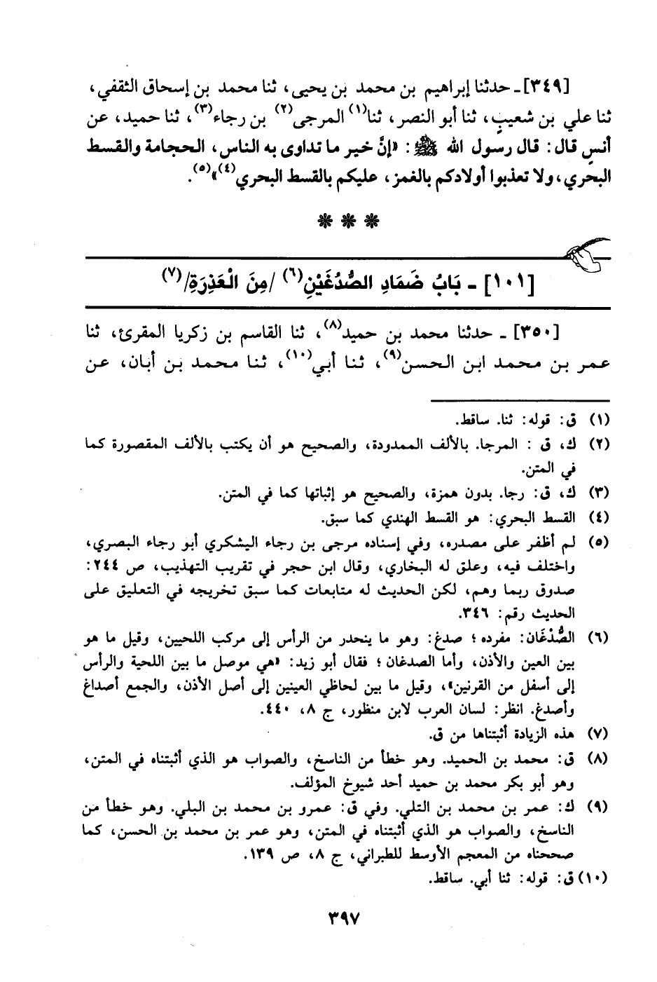 349- حَدَّثَنا إبراهيم بن محمد بن يحيى، حَدَّثَنا محمد بن إسحاق الثقفي، حَدَّثَنا علي بن شعيب، حَدَّثَنا أبو النصر، حَدَّثَنا المرجي بن رجاء، حَدَّثَنا حميد، عَن أنس، قال: قال رسول الله صَلَّى الله عَليْهِ وَسلَّم: إن خير ما تداوى به الناس الحجامة والقسط البحري ولا تعذبوا أولادكم بالغمز عليكم بالقسط البحري.