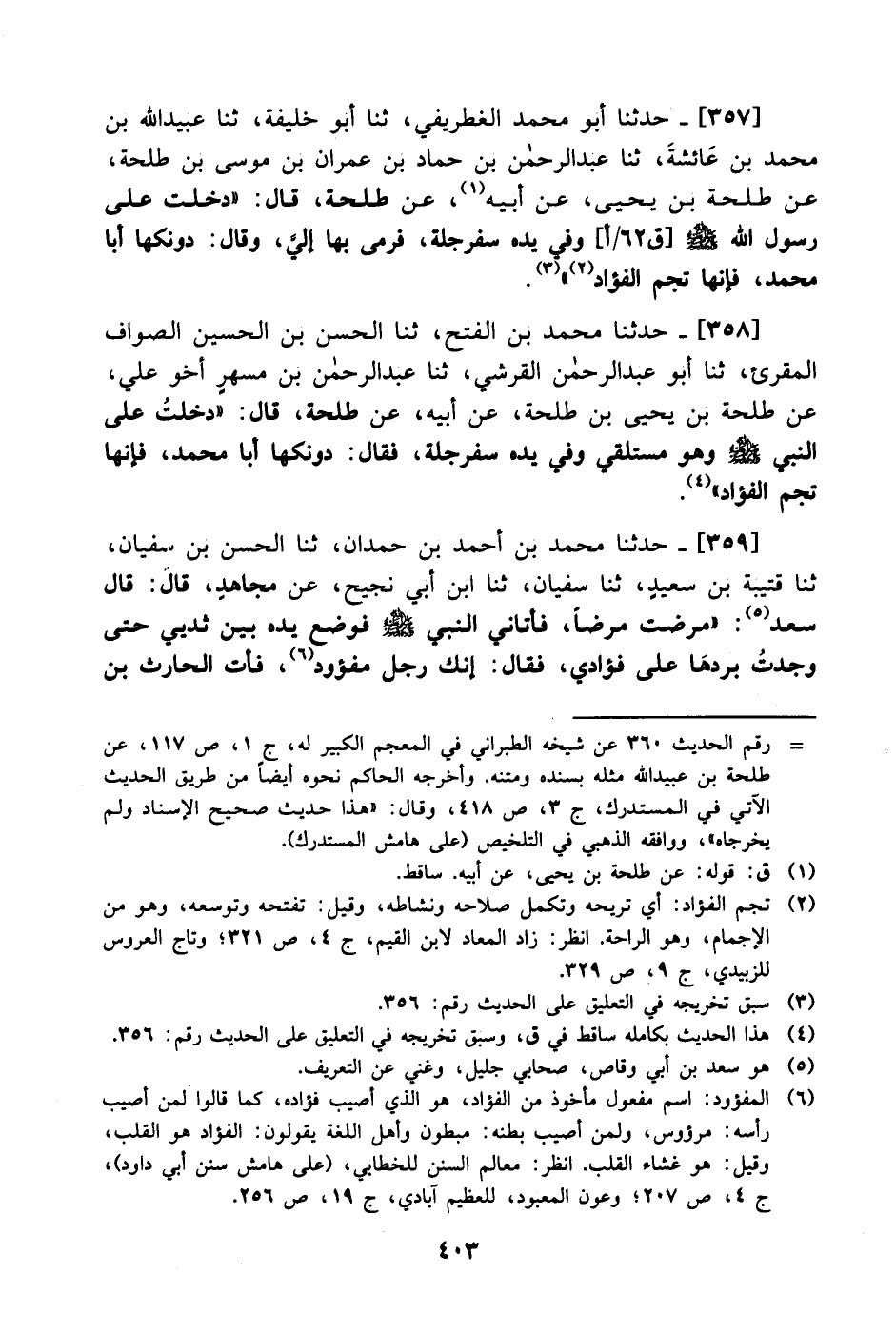 357- حَدَّثَنا أبو محمد الغطريفي، حَدَّثَنا أبو خليفة، حَدَّثَنا عبيد الله بن محمد بن عائشة، حَدَّثَنا عبد الرحمن بن حماد بن عمران بن موسى بن طلحة، عَن طلحة بن يحيى، عَن أبيه، عَن طلحة قال: دخلت على رسول الله صَلَّى الله عَليْهِ وَسلَّم وفي يده سفرجلة فرمى بها إلي وقال: دونكما أبا محمد فإنها تجم الفؤاد.