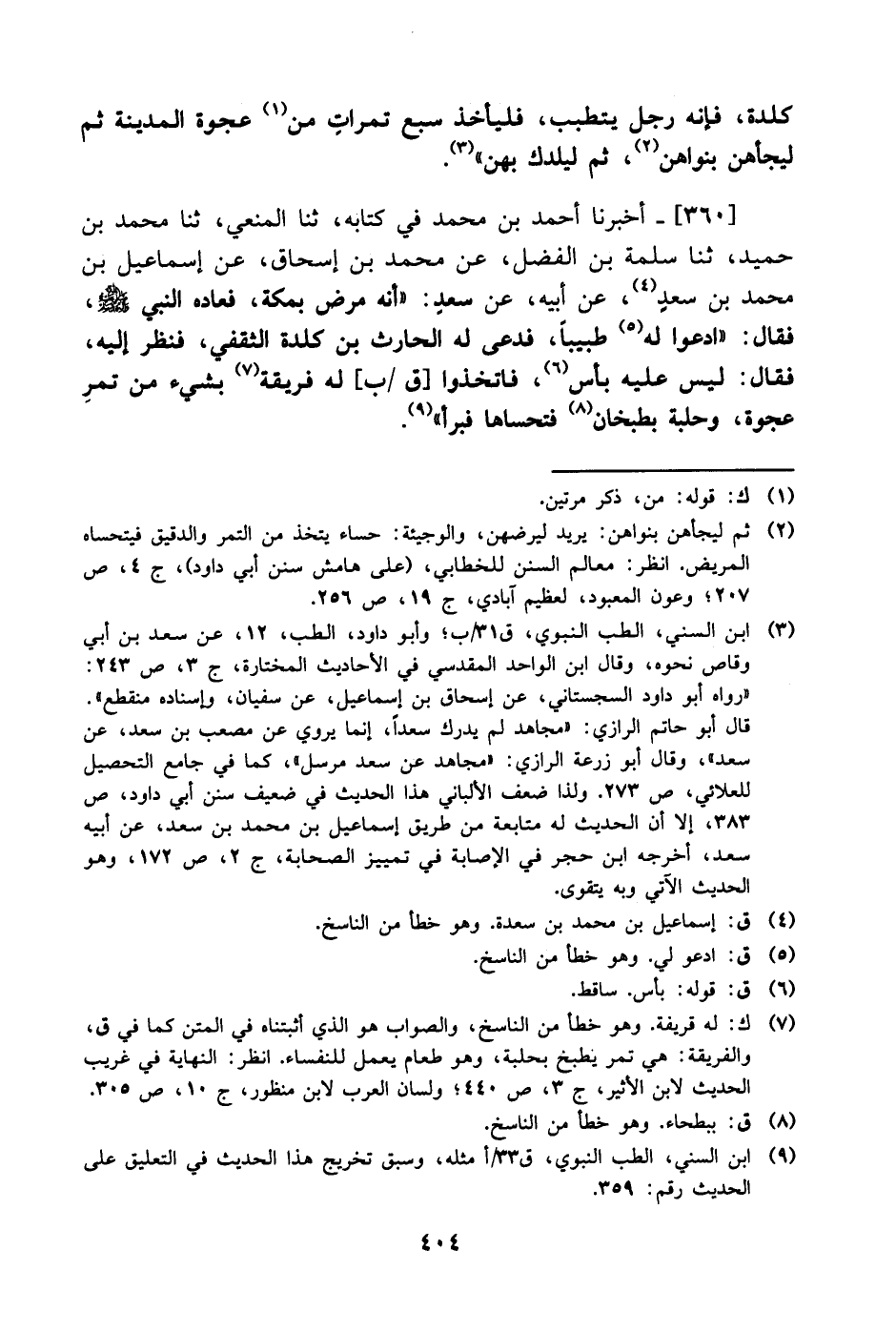 360- أخبرنا أحمد بن محمد في كتابه، حَدَّثَنا المنعي، حَدَّثَنا محمد بن حميد، حَدَّثَنا سلمة بن الفضل، عَن محمد بن إسحاق، عَن إسماعيل بن محمد بن سعد، عَن أبيه، عَن سعد: أنه مرض بمكة فعاده النبي صَلَّى الله عَليْهِ وَسلَّم فقال: ادعوا له طبيبا فدعى له الحارث بن كلدة الثقفي فنظر إليه فقال: ليس عليه بأس فاتخذوا له فريقة بشيء من تمر عجوة وحلبة بطبخان فتحساها فبرأ.