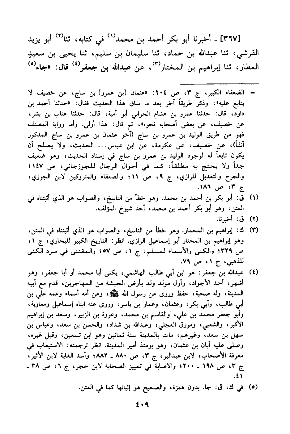 367- أخبرنا أبو بكر أحمد بن محمد في كتابه، حَدَّثَنا أبو يزيد القرشي، حَدَّثَنا عبد الله بن حماد، حَدَّثَنا سليمان بن سليم، حَدَّثَنا يحيى بن سعيد العطار، حَدَّثَنا إبراهيم بن المختار، عَن عَبد الله بن جعفر قال: جاء -[410]- رجل إلى علي بن أبي طالب فشكا إليه النسيان فقال: عليك باللبان فإنه يشجع القلب ويذهب بالنسيان.