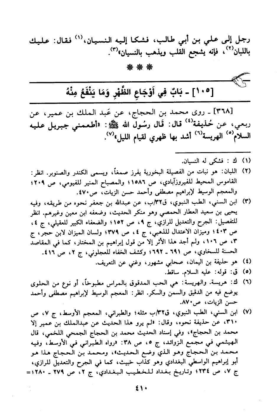 368- روى محمد بن الحجاج، عَن عَبد الملك بن عمير، عَن ربعي، عَن حذيفة، قال: قال رسول الله صَلَّى الله عَليْهِ وَسلَّم: اطمعني جبريل عليه السلام الهريسة أشد بها ظهري لقيام الليل.