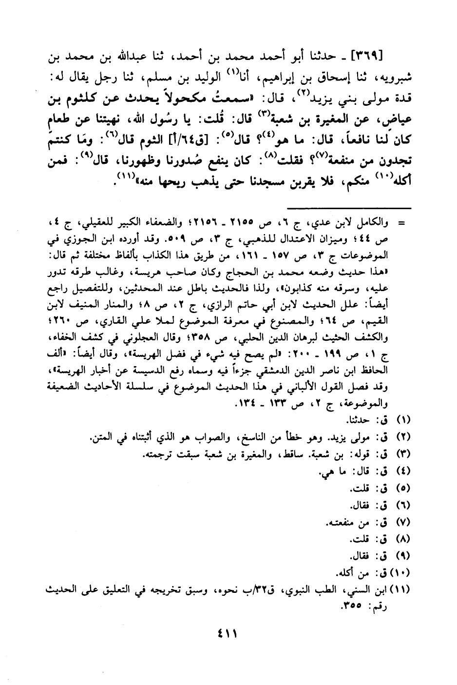 369- حَدَّثَنا أبو أحمد محمد بن أحمد، حَدَّثَنا عبد الله بن محمد بن شبرويه، حَدَّثَنا إسحاق بن إبراهيم، أَخْبَرنا الوليد بن مسلم، حَدَّثَنا رجل يقال له: قده مولى بني يزيد قال: سمعت مكحولا يحدث، عَن كلثوم بن عياض، عَن المغيرة بن شعبة قال: قلت: يا رسول الله نهيتنا، عَن طعام كان لنا نافعا قال: ما هو؟ قال: الثوم قال: وما كنتم تجدون من منفعة؟ فقلت: كان ينفع صدورنا وظهورنا قال: فمن أكله منكم فلا يقربن مسجدنا حتى يذهب ريحها منه.