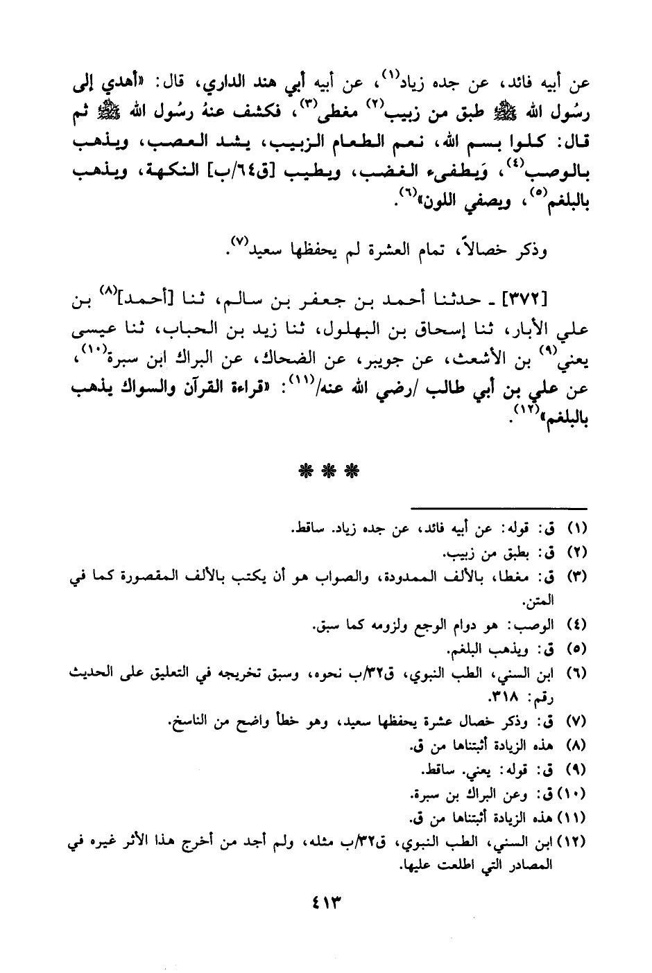 372- حَدَّثَنا أحمد بن جعفر بن سالم، حَدَّثَنا أحمد بن علي الأبار، حَدَّثَنا إسحاق بن البهلول، حَدَّثَنا زيد بن الحباب، حَدَّثَنا عيسى يعني بن الأشعث، عَن جويبر، عَن الضحاك، عَن البراك ابن سبرة، عَن علي بن أبي طالب رضي الله عنه: قراءة القرآن والسواك يذهب بالبلغم.