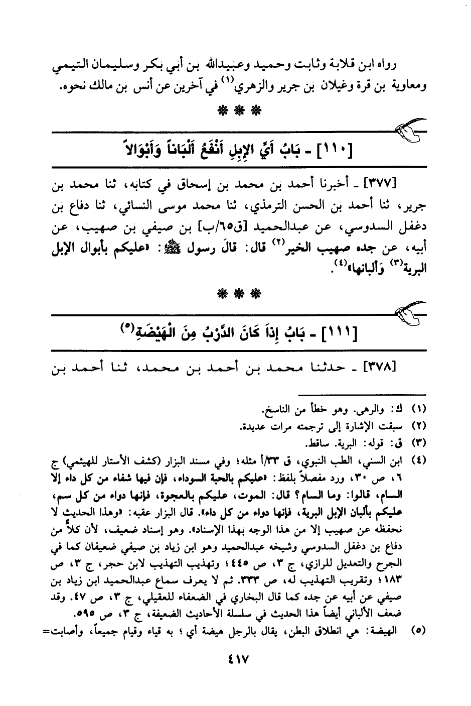 377- أخبرنا أحمد بن محمد بن إسحاق في كتابه، حَدَّثَنا محمد بن جرير، حَدَّثَنا أحمد بن الحسن الترمذي، حَدَّثَنا محمد بن موسى النسائي، حَدَّثَنا دفاع بن دغفل السدوسي، عَن عَبد الحميد بن صيفي بن صهيب، عَن أبيه، عَن جَدِّه صهيب الخير، قال: قال رسول الله صَلَّى الله عَليْهِ وَسلَّم: عليكم بأبوال الإبل البرية وألبانها.