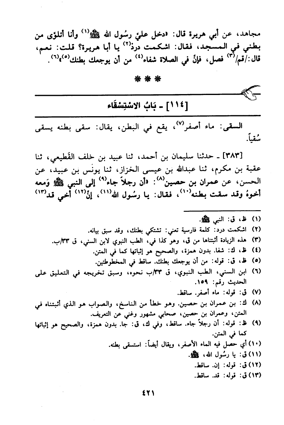 383- حَدَّثَنا سليمان بن أحمد، حَدَّثَنا عبيد بن خلف القطيعي، حَدَّثَنا عقبة بن مكرم، حَدَّثَنا عبد الله بن عيسى الخزاز، حَدَّثَنا يونس بن عبيد، عَن الحسن، عَن عمران بن حصين: أن رجلا جاء إلى النبي صَلَّى الله عَليْهِ وَسلَّم ومعه أخوه وقد سقت بطنه فقال: يا رسول الله إن أخي قد -[422]- سقت بطنه فأتيت به الأطباء فأمروني بالكي أفأكويه؟ فقال له رسول الله صَلَّى الله عَليْهِ وَسلَّم: لا تكوه ورده إلى أهله فمر به بعير فضرب بطنه فانخمص بطنه فأتى به للنبي صَلَّى الله عَليْهِ وَسلَّم فقال: أما إنك لو أتيت به الأطباء قلت: النار شفته.