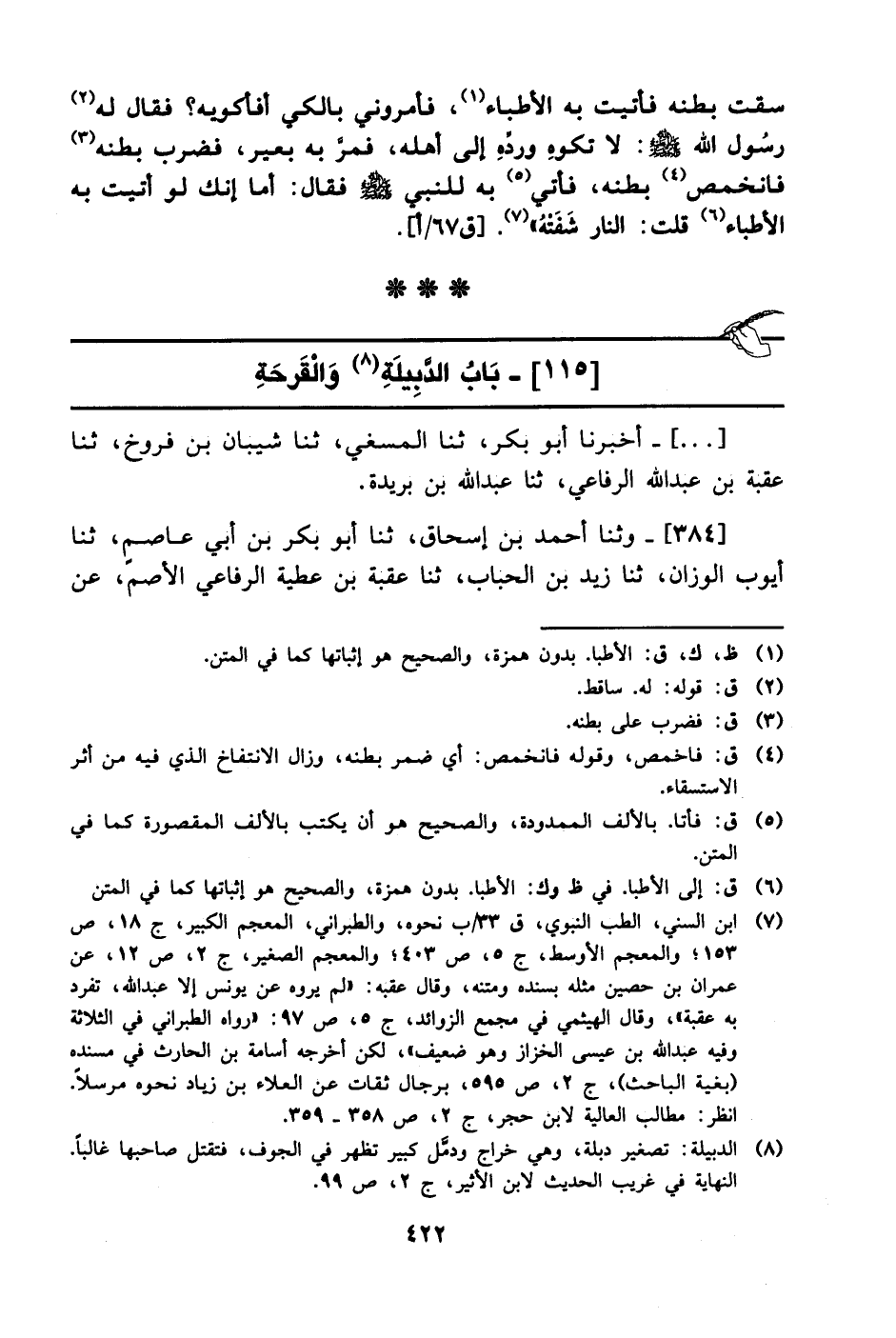 [..] وثنا أحمد بن إسحاق، حَدَّثَنا أبو بكر بن أبي عاصم، حَدَّثَنا أيوب الوزان، حَدَّثَنا زيد بن الحباب، حَدَّثَنا عقبة بن عطية الرفاعي الأصم، عَن -[423]- عَبد الله بن بريدة قال: حدثني عم عامر بن الطفيل: أن عامر بن الطفيل أهدى إلى رسول الله صَلَّى الله عَليْهِ وَسلَّم فرسا وكتب إليه عامر: إنه قد ظهرت به دبيلة فابعث إلي بدواء من عندك قال: فرد رسول الله صَلَّى الله عَليْهِ وَسلَّم الفرس لأنه لم يكن أسلم وأهدى إليه رسول الله صَلَّى الله عَليْهِ وَسلَّم عكة من عسل وقال: تداوى بهذا.