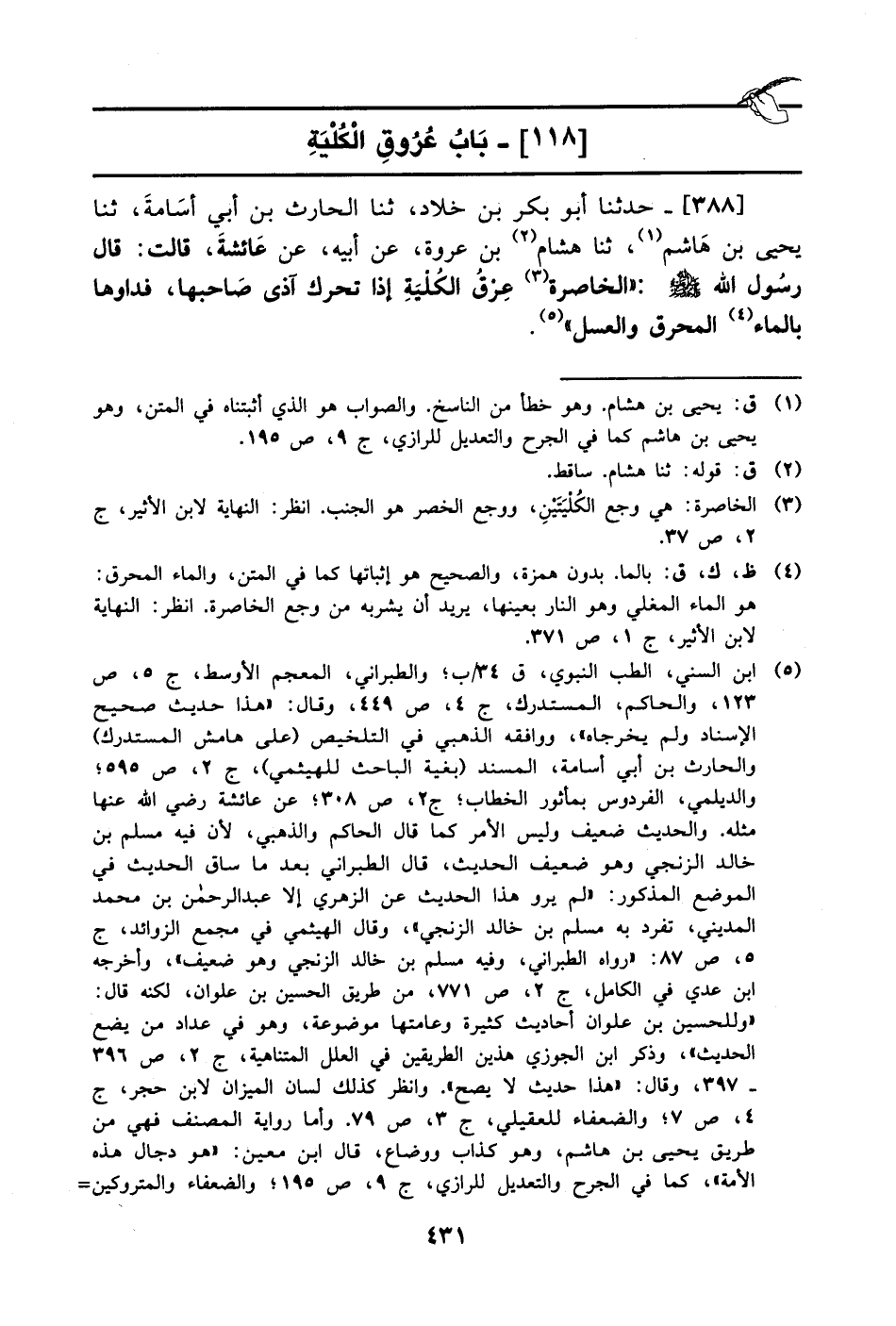 388- حَدَّثَنا أبو بكر بن خلاد، حَدَّثَنا الحارث بن أبي أسامة، حَدَّثَنا يحيى بن هاشم، حَدَّثَنا هشام بن عروة، عَن أبيه، عَن عائشة قالت: قال رسول الله صَلَّى الله عَليْهِ وَسلَّم: الخاصرة عرق الكلية إذا تحرك آذى صاحبها فداوها بالماء المحرق والعسل.