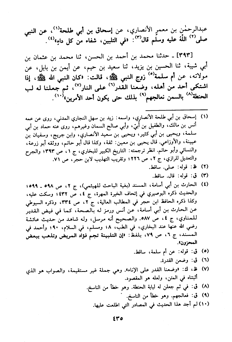 393- حَدَّثَنا محمد بن أحمد بن الحسن، حَدَّثَنا محمد بن عثمان بن أبي شيبة، حَدَّثَنا الحسين بن يزيد، حَدَّثَنا سعيد بن حيم، عَن أيمن بن بابل، عَن مولاته، عَن أم سلمة زوج النبي صَلَّى الله عَليْهِ وَسلَّم قالت: كان النبي صَلَّى الله عَليْهِ وَسلَّم إذا اشتكى أحد من أهله وضعنا القدر على النار ثم جعلنا له لب الحنطة بالسمن نعالجهم بذلك حتى يكون أحد الأمرين.