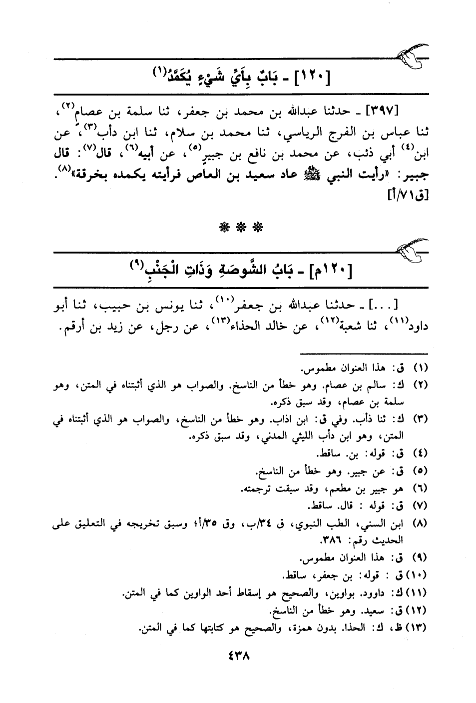 397- حَدَّثَنا عبد الله بن محمد بن جعفر، حَدَّثَنا سلمة بن عصام، حَدَّثَنا عباس بن الفرج الرياسي، حَدَّثَنا محمد بن سلام، حَدَّثَنا ابن دأب، عَن ابن أبي ذئب، عَن محمد بن نافع بن جبير، عَن أبيه، قال: قال جبير: رأيت النبي صَلَّى الله عَليْهِ وَسلَّم عاد سعيد بن العاص فرأيته يكمده بخرقة.