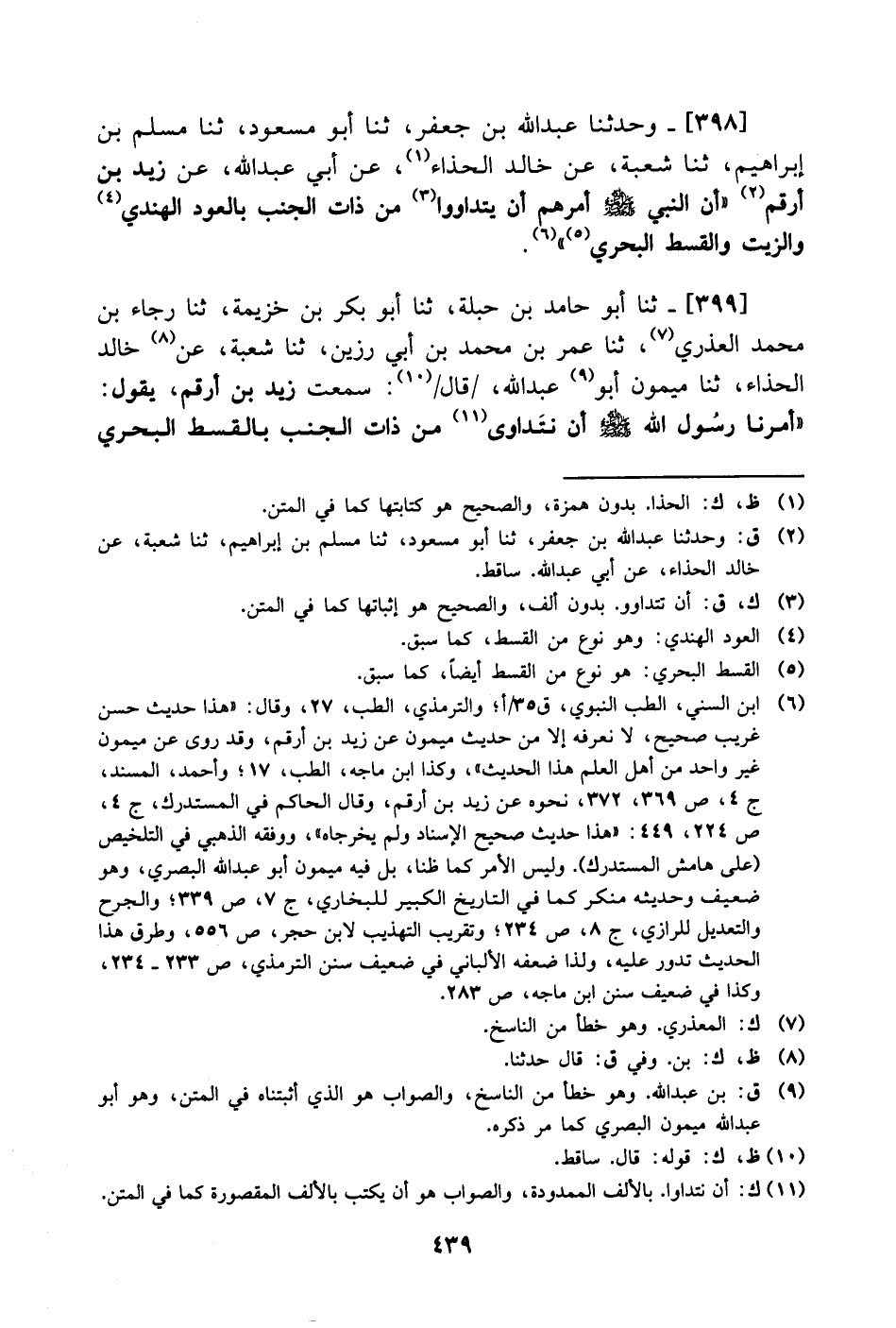 399- حَدَّثَنا أبو حامد بن حبلة، حَدَّثَنا أبو بكر بن خزيمة، حَدَّثَنا رجاء بن محمد العذري، حَدَّثَنا عُمَر بن محمد بن أبي رزين، حَدَّثَنا شعبة، عَن خالد الحذاء، حَدَّثَنا ميمون أبو عبد الله قال: سمعت زيد بن أرقم يقول: أمرنا رسول الله صَلَّى الله عَليْهِ وَسلَّم أن نتداوى من ذات الجنب بالقسط البحري -[440]- والزيت.