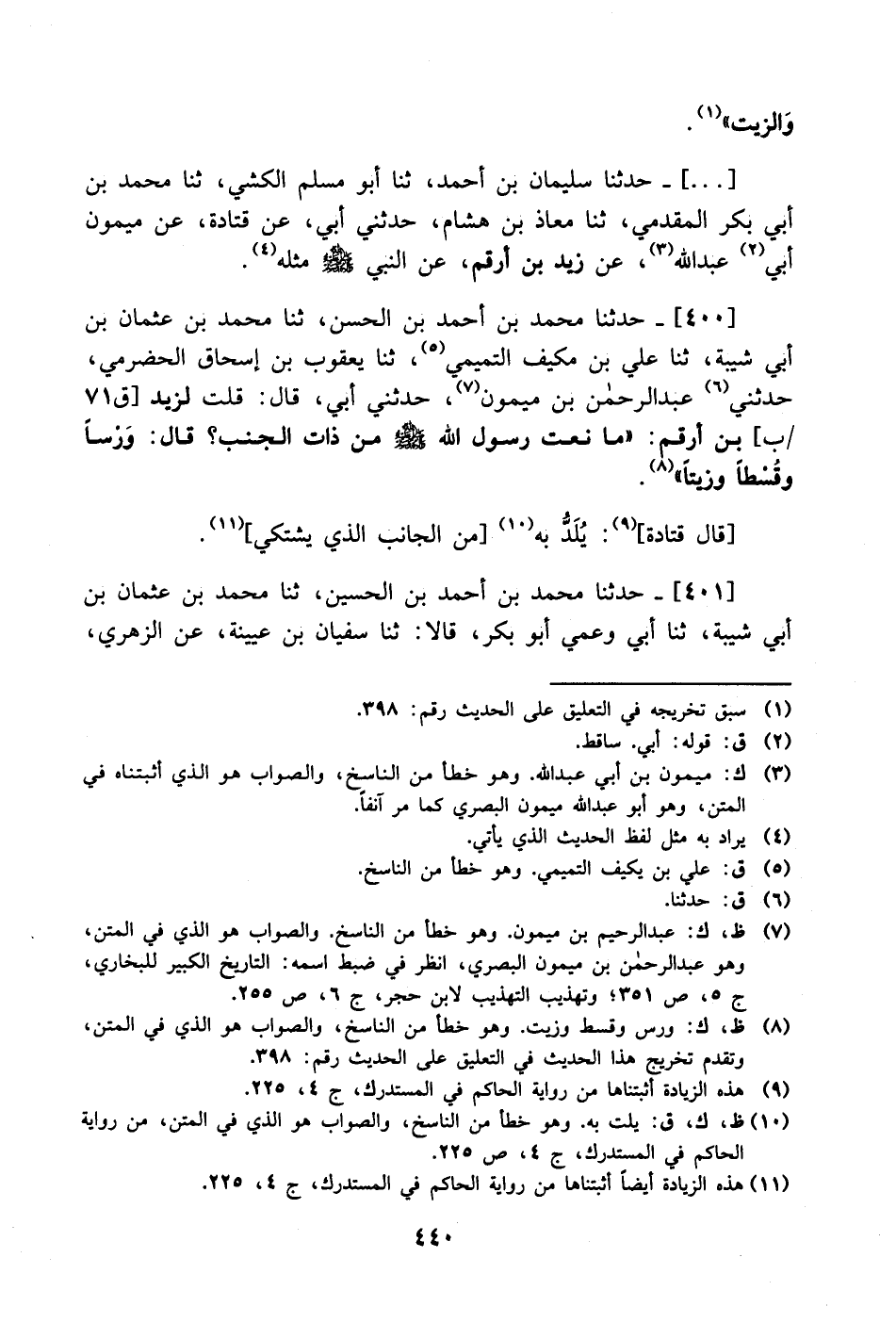 400- حَدَّثَنا محمد بن أحمد بن الحسن، حَدَّثَنا محمد بن عثمان بن أبي شيبة، حَدَّثَنا علي بن مكيف التميمي، حَدَّثَنا يعقوب بن إسحاق الحضرمي حدثني عبد الرحمن بن ميمون حدثني أبي قال: قلت لزيد بن أرقم: ما نعت رسول الله صَلَّى الله عَليْهِ وَسلَّم من ذات الجنب؟ قال: ورسا وقسطا وزيتا.