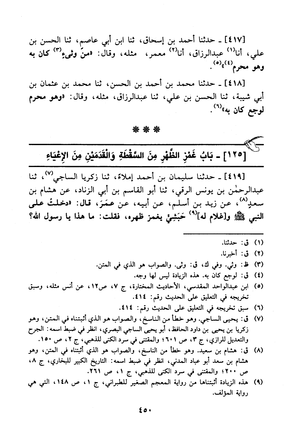 418- حَدَّثَنا محمد بن أحمد بن الحسن، حَدَّثَنا محمد بن عثمان بن أبي شيبة، حَدَّثَنا الحسن بن علي، حَدَّثَنا عبد الرزاق مثله وقال: وهو محرم لوجع كان به.
