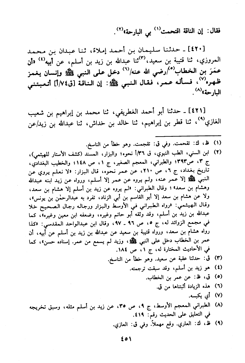 420- حَدَّثَنا سليمان بن أحمد إملاء، حَدَّثَنا عبدان بن محمد المروزي، حَدَّثَنا قتيبة بن سعيد، حَدَّثَنا عبد الله بن زيد بن أسلم، عَن أبيه أن عُمَر بن الخطاب رضي الله عنه دخل على النبي صَلَّى الله عَليْهِ وَسلَّم وإنسان يغمز ظهره فسأله عُمَر فقال النبي صَلَّى الله عَليْهِ وَسلَّم: إن الناقة أتعبتني البارحة.