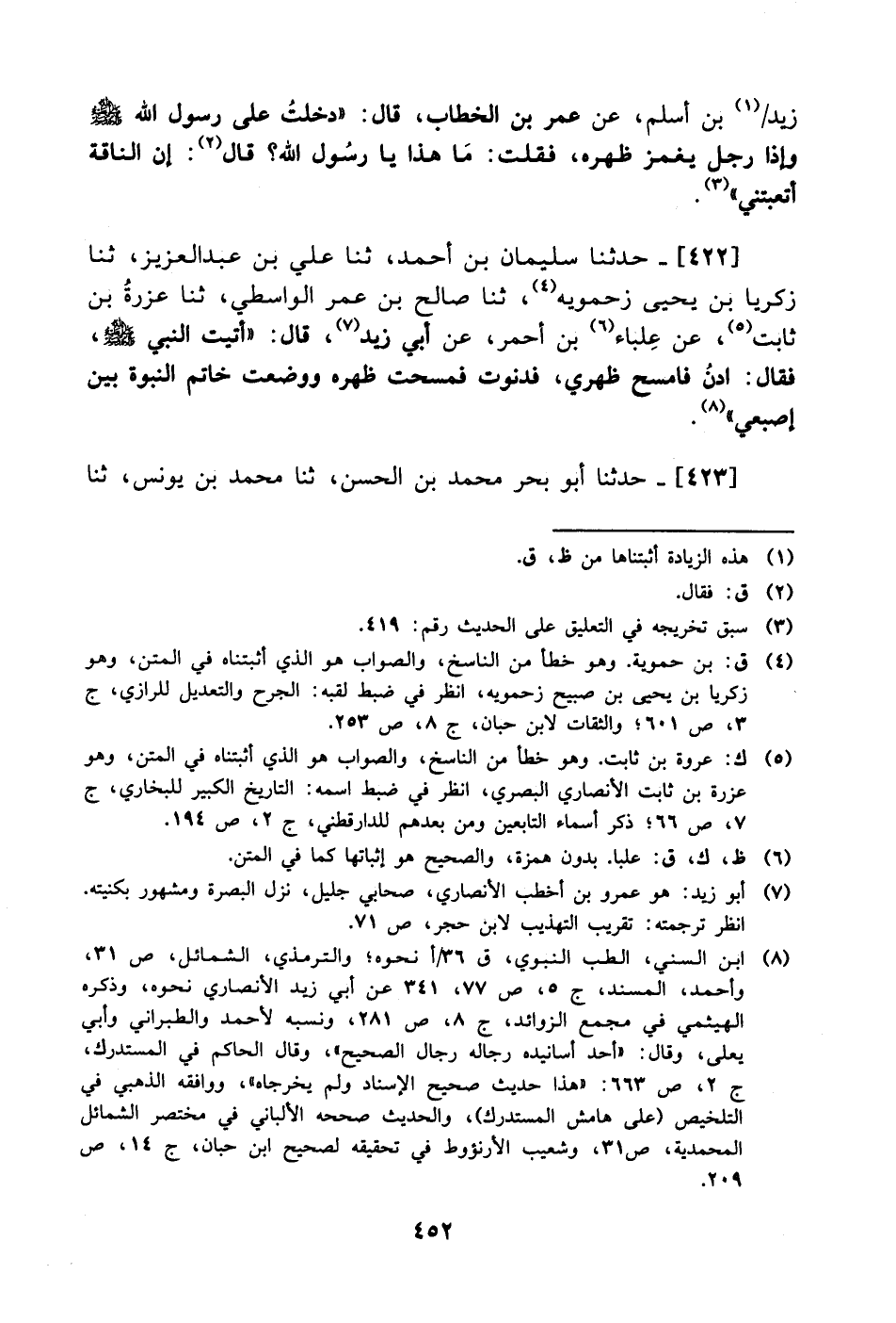 422- حَدَّثَنا سليمان بن أحمد، حَدَّثَنا علي بن عبد العزيز، حَدَّثَنا زكريا بن يحيى زحمويه، حَدَّثَنا صالح بن عُمَر الواسطي، حَدَّثَنا عزرة بن ثابت، عَن علباء بن أحمر، عَن أَبِي زيد قال: أتيت النبي صَلَّى الله عَليْهِ وَسلَّم فقال: ادن فامسح ظهري فدنوت فمسحت ظهره ووضعت خاتم النبوة بين إصبعي.