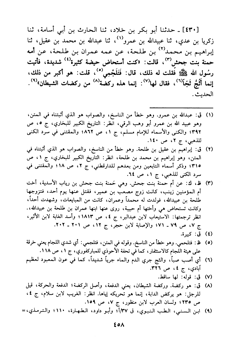 430- حَدَّثَنا أبو بكر بن خلاد، حَدَّثَنا الحارث بن أبي أسامة، حَدَّثَنا زكريا بن عدي، حَدَّثَنا عبيد الله بن عَمْرو، حَدَّثَنا عبد الله بن محمد بن عقيل، حَدَّثَنا إبراهيم بن محمد بن طلحة، عَن عمه عمران بن طلحة، عَن أمه حمنة بنت جحش قالت: كنت أستحاض حيضة كثيرة شديدة فأتيت رسول الله صَلَّى الله عَليْهِ وَسلَّم فقلت له ذلك قال: فتلجمي قلت: هو أكبر من ذلك إنما أثج ثجا فقال لها: إنما هذه ركضة من ركضات الشيطان الحديث.