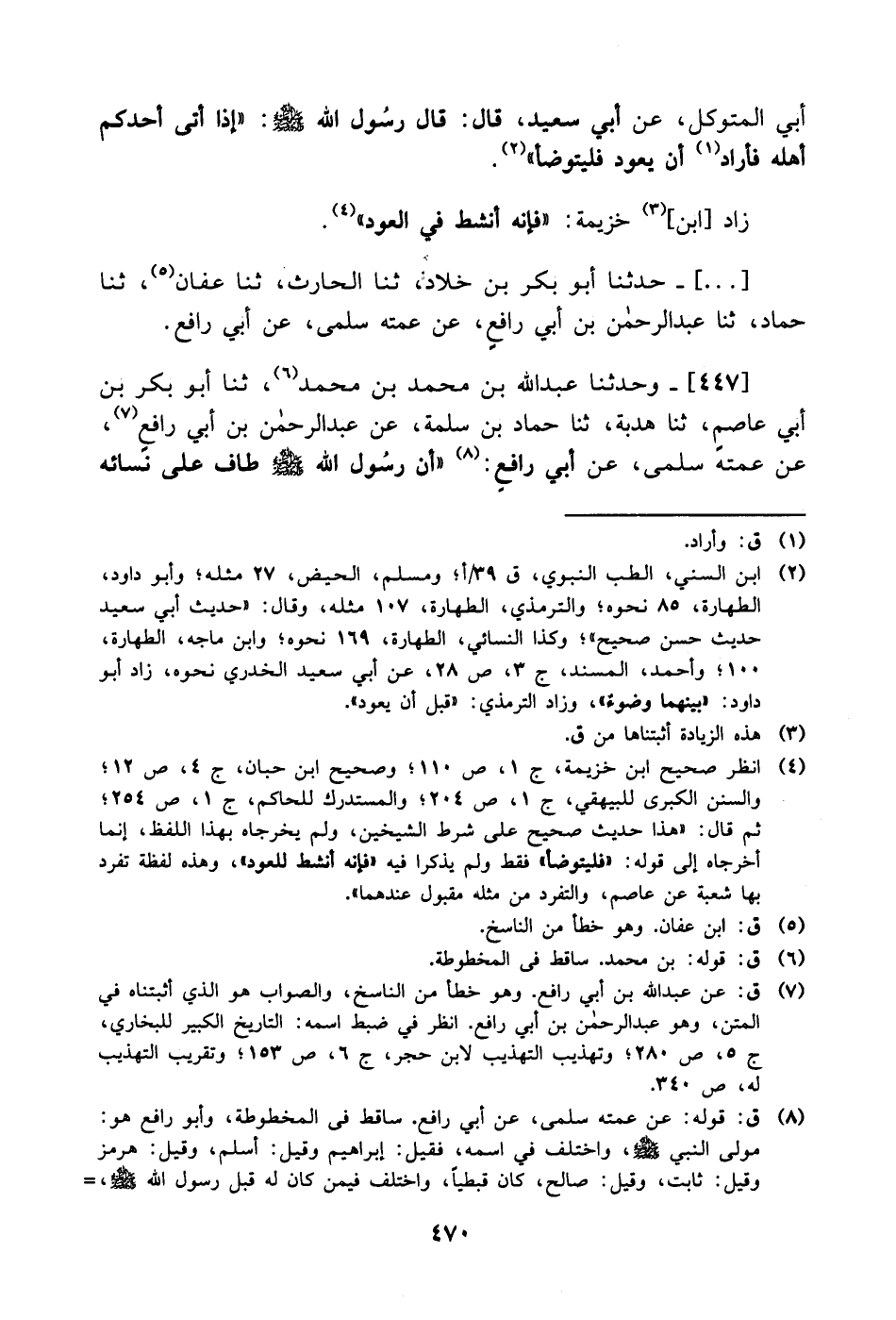 [..] وَحَدَّثنا عبد الله بن محمد بن محمد، حَدَّثَنا أبو بكر بن أبي عاصم، حَدَّثَنا هدبة، حَدَّثَنا حماد بن سلمة، عَن عَبد الرحمن بن أبي رافع، عَن عمته سلمة، عَن أَبِي رافع: أن رسول الله صَلَّى الله عَليْهِ وَسلَّم طاف على نسائه -[471]- جمع فاغتسل عند كل واحدة منهن غسلا فقلت: يا رسول الله ألا جعلته غسلا واحدا؟ فقال: هذا أزكى وأطهر وأطيب.