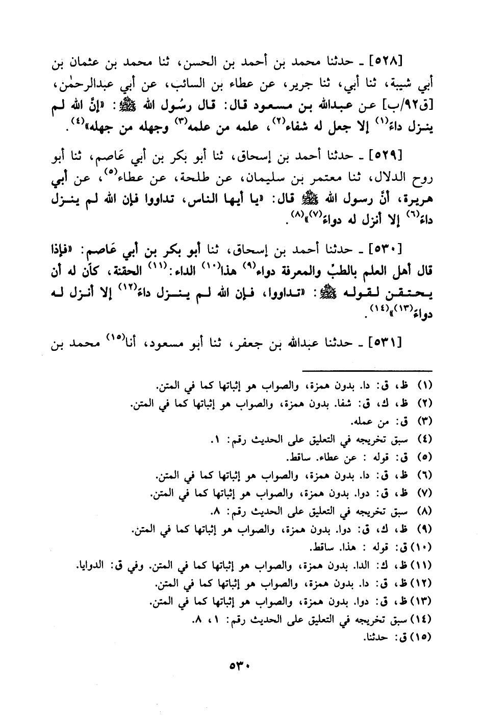 528- حَدَّثَنا محمد بن أحمد بن الحسن، حَدَّثَنا محمد بن عثمان بن أبي شيبة، حَدَّثَنا أبي، حَدَّثَنا جرير، عَن عَطاء بن السائب، عَن أَبِي عبد الرحمن، عَن عَبد الله بن مسعود، قال: قال رسول الله صَلَّى الله عَليْهِ وَسلَّم: إن الله لم ينزل داء إلا جعل له شفاء علمه من علمه وجهله من جهله.