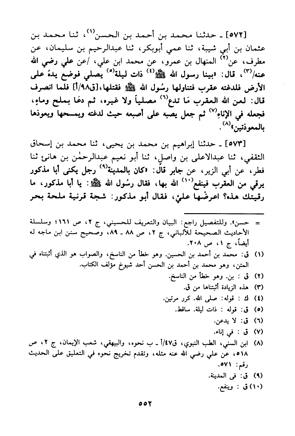 572- حَدَّثَنا محمد بن أحمد بن الحسن، حَدَّثَنا محمد بن عثمان بن أبي شيبة، حَدَّثَنا عمي أبو بكر، حَدَّثَنا عبد الرحيم بن سليمان، عَن مطرف، عَن المنهال بن عَمْرو، عَن محمد بن علي، عَن علي رضي الله عنه قال: بينا رسول الله صَلَّى الله عَليْهِ وَسلَّم ذات ليلة يصلي فوضع يده على الأرض فلدغته عقرب فتناولها رسول الله صَلَّى الله عَليْهِ وَسلَّم فقتلها فلما انصرف قال: لعن الله العقرب ما تدع مصليا ولا غيره ثم دعا بملح وماء فجعله في الإناء ثم جعل يصبه على أصبعه حيث لدغته ويمسحها ويعوذها بالمعوذتين.