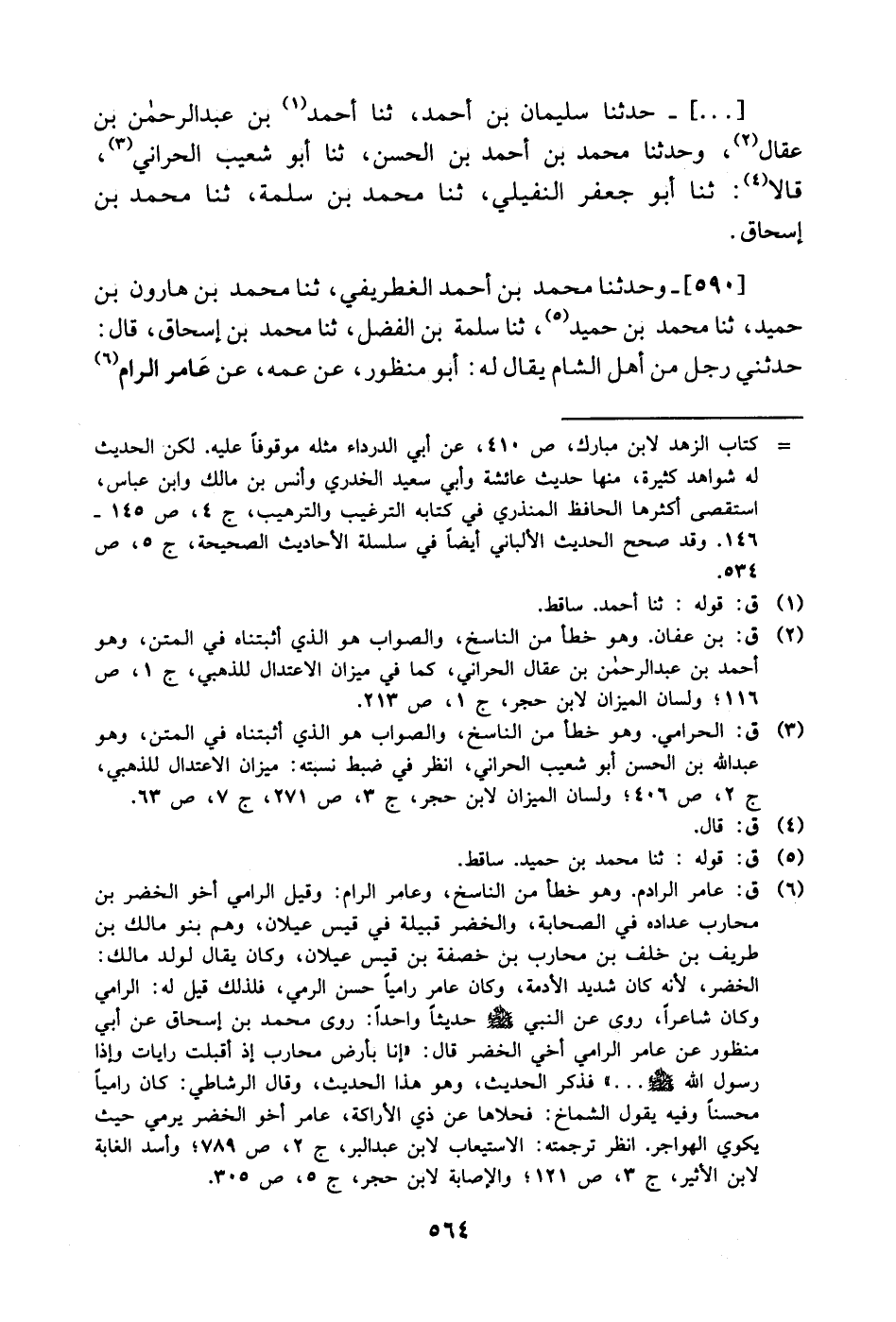 590- حدثنا سليمان بن أحمد، ثنا أحمد بن عبد الرحمن بن عقال، وحدثنا محمد بن أحمد بن الحسن، ثنا أبوشعيب الحراني، قالا: ثنا أبوجعفر النفيلي، ثنا محمد بن سلمة، ثنا محمد بن إسحاق.