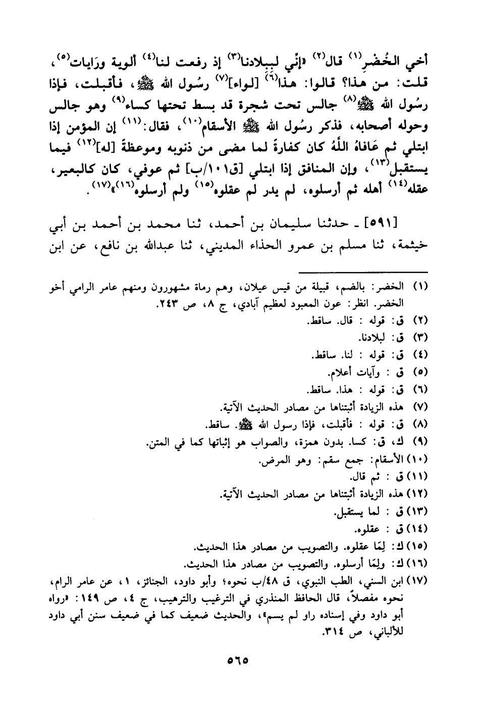591- حَدَّثَنا سليمان بن أحمد، حَدَّثَنا محمد بن أحمد بن أبي خيثمة، حَدَّثَنا مسلم بن عَمْرو الحذاء المديني، حَدَّثَنا عبد الله بن نافع، عَن ابن -[566]- أبي ذئب، عَن هشام بن عروة، عَن أبيه، عَن عائشة أن النبي صَلَّى الله عَليْهِ وَسلَّم قال: إذا اشتكى المؤمن أخلصه الله من الذنوب كما يخلص الكير الخبث من الحديد.