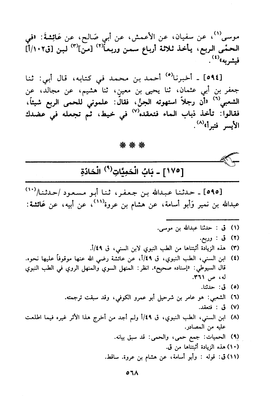 594- أخبرنا أحمد بن محمد في كتابه قال أبي:، حَدَّثَنا جعفر بن أبي عثمان، حَدَّثَنا يحيى بن معين، حَدَّثَنا هشيم، عَن مجالد، عَن الشعبي أن رجلا استهوته الجن فقال: علموني للحمى الربع شيئا فقالوا: تأخذ ذباب الماء فتعقده في خيط ثم تجعله في عضدك الأيسر فتبرأ.
