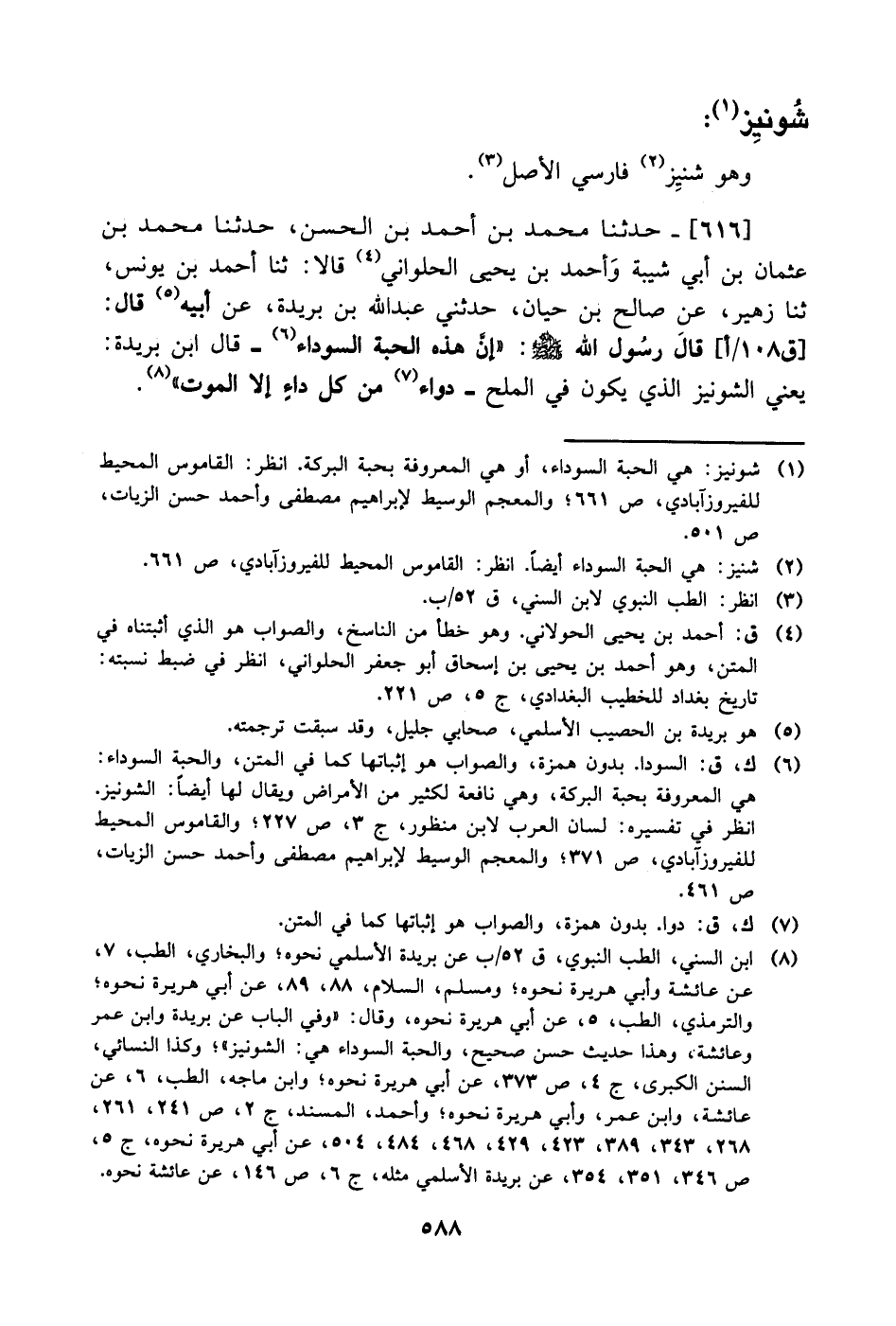 616- حَدَّثَنا محمد بن أحمد بن الحسن حَدَّثَنا محمد بن عثمان بن أبي شيبة وأحمد بن يحيى الحلواني قالا:، حَدَّثَنا أحمد بن يونس، حَدَّثَنا زهير، عَن صالح بن حيان حدثني عبد الله بن بريدة، عَن أبيه، قال: قال رسول الله صَلَّى الله عَليْهِ وَسلَّم: إن هذه الحبة السوداء قال ابن بريدة: يعني الشونيز الذي يكون في الملح دواء من كل داء إلا الموت.