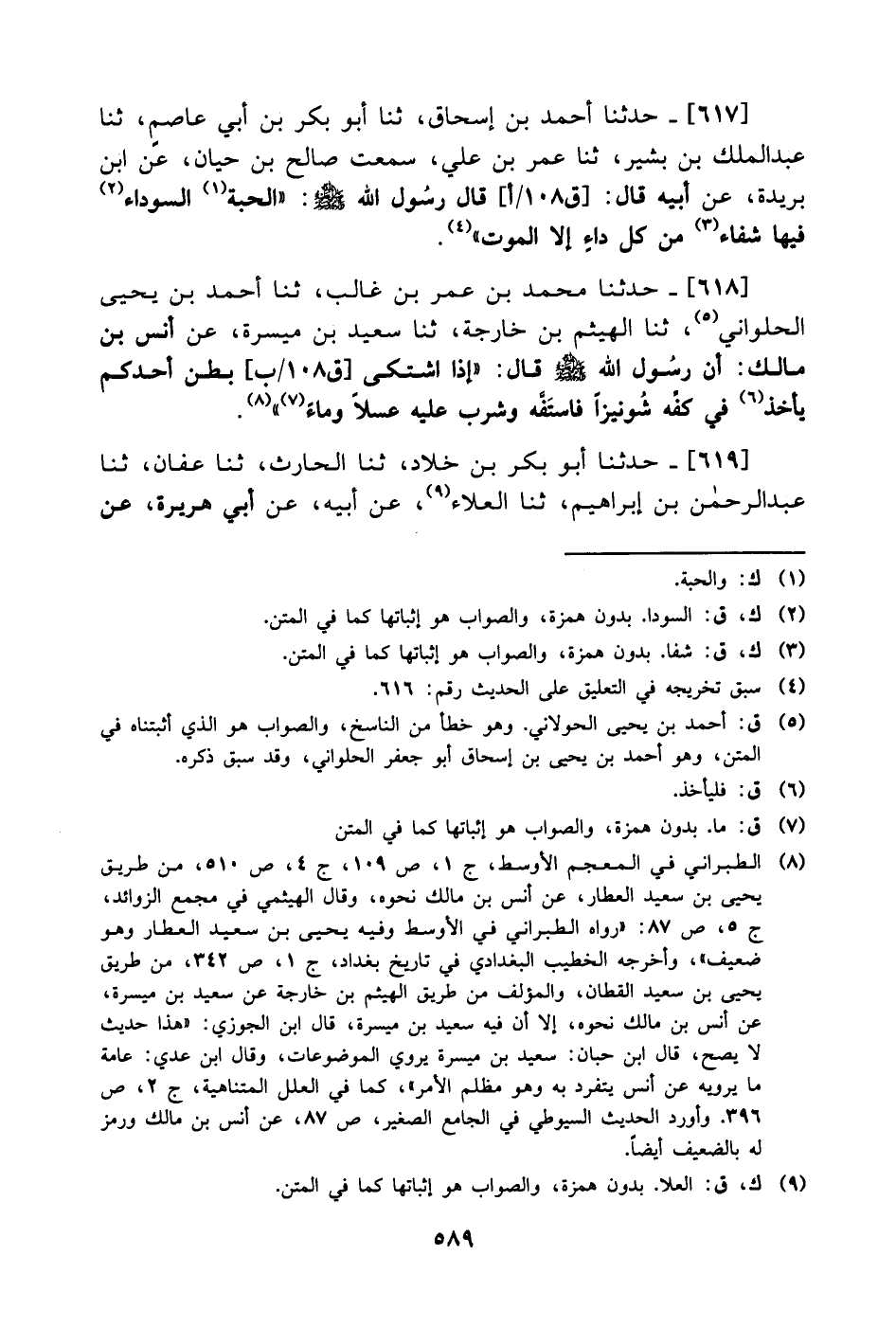 619- حَدَّثَنا أبو بكر بن خلاد، حَدَّثَنا الحارث، حَدَّثَنا عفان، حَدَّثَنا عبد الرحمن بن إبراهيم، حَدَّثَنا العلاء، عَن أبيه، عَن أَبِي هُرَيرة، عَن -[590]- رسول الله صَلَّى الله عَليْهِ وَسلَّم قال: ما من داء إلا في حبة السوداء منه شفاء إلا السام.
