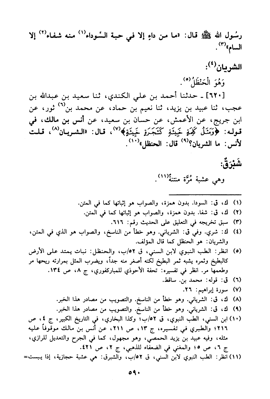 620- حَدَّثَنا أحمد بن علي الكندي، حَدَّثَنا سعيد بن عبد الله بن عجب، حَدَّثَنا عبيد بن يزيد، حَدَّثَنا نعيم بن حماد، عَن محمد بن ثور، عَن ابن جُرَيج، عَن الأعمش، عَن حسان بن سعيد، عَن أنس بن مالك في قوله {ومثل كلمة خبيثة كشجرة خبيثة} قال: الشريان قلت لأنس ما الشريان؟ قال: الحنظل.