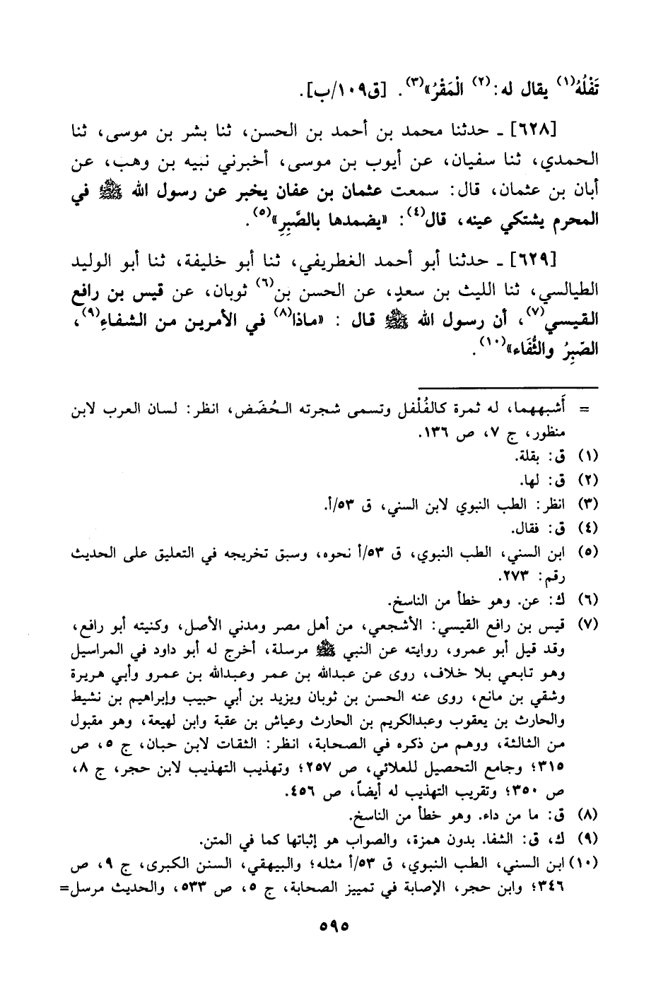 629- حَدَّثَنا أبو أحمد الغطريفي، حَدَّثَنا أبو خليفة، حَدَّثَنا أبو الوليد الطيالسي، حَدَّثَنا الليث بن سعد، عَن الحسن بن ثوبان، عَن قيس بن رافع القيسي أن رسول الله صَلَّى الله عَليْهِ وَسلَّم قال: ماذا في الأمرين من الشفاء الصبر والثفاء.