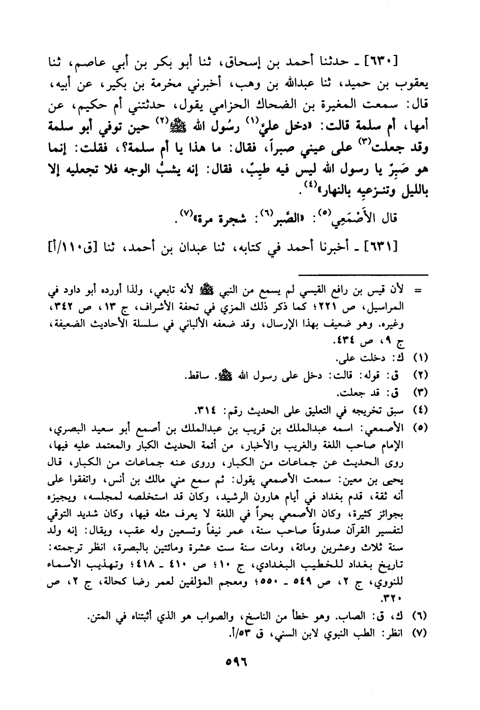 630- حَدَّثَنا أحمد بن إسحاق، حَدَّثَنا أبو بكر بن أبي عاصم، حَدَّثَنا يعقوب بن حميد، حَدَّثَنا عبد الله بن وهب أخبرني مخرمة بن بكير، عَن أبيه قال: سمعت المغيرة بن الضحاك الحزامي يقول حدثتني أم حكيم، عَن أمها أم سلمة قالت: دخل علي رسول الله صَلَّى الله عَليْهِ وَسلَّم حيت توفي أبو سلمة وقد جعلت على عيني صبرا فقال: ما هذا ياأم سلمة؟ فقلت: إنما هو صبر يا رسول الله ليس فيه طيب فقال: إنه يشب الوجه فلا تجعليه إلا بالليل وتنزعيه بالنهار.