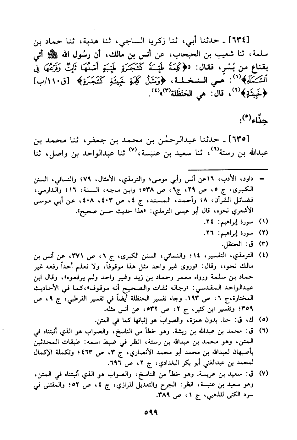 634- حَدَّثَنا أبي، حَدَّثَنا زكريا الساجي، حَدَّثَنا هدبة، حَدَّثَنا حماد بن سلمة، حَدَّثَنا شعيب بن الحبحاب، عَن أنس بن مالك أن رسول الله صَلَّى الله عَليْهِ وَسلَّم أتى بقناع من بسر فقال: {كلمة طيبة كشجرة طيبة أصلها ثابت وفرعها في السماء} هي النخلة {ومثل كلمة خبيثة كشجرة} {خبيثة} قال: هي الحنظلة.
