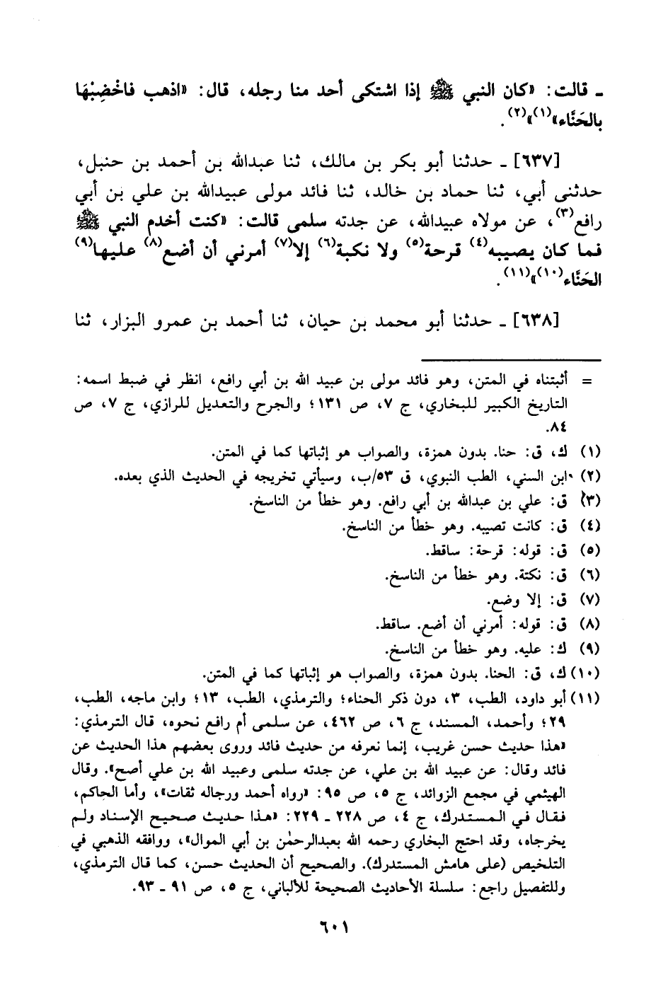 637- حَدَّثَنا أبو بكر بن مالك، حَدَّثَنا عبد الله بن أحمد بن حنبل حدثني أبي، حَدَّثَنا حماد بن خالد، حَدَّثَنا فائد مولى عبيد الله بن علي بن أبي رافع، عَن مولاه عبيد الله، عَن جدته سلمى قالت: كنت أخدم النبي صَلَّى الله عَليْهِ وَسلَّم فما كان يصيبه قرحة ولا نكبة إلا أمرني أن أضع عليها الحناء.
