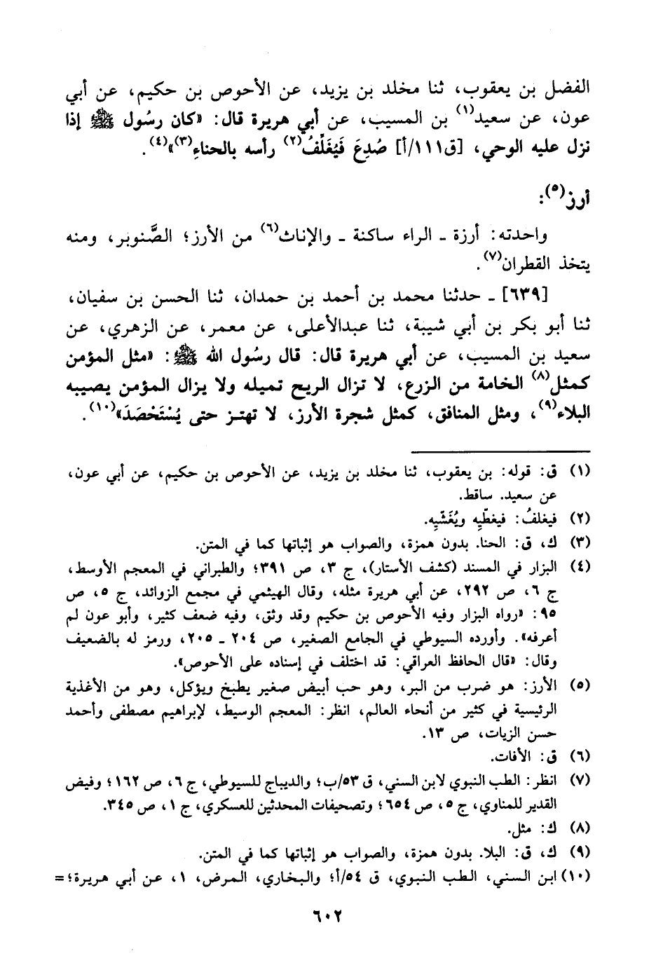 639- حَدَّثَنا محمد بن أحمد بن حمدان، حَدَّثَنا الحسن بن سفيان، حَدَّثَنا أبو بكر بن أبي شيبة، حَدَّثَنا عبد الأعلى، عَن معمر، عَن الزُّهْرِيّ، عَن سعيد بن المُسَيَّب، عَن أَبِي هُرَيرة، قال: قال رسول الله صَلَّى الله عَليْهِ وَسلَّم: مثل المؤمن كمثل الخامة من الزرع لا تزال الريح تميله ولا يزال المؤمن يصيبه البلاء ومثل المنافق كمثل شجرة الأرز لا تهتز حتى يستحصد.