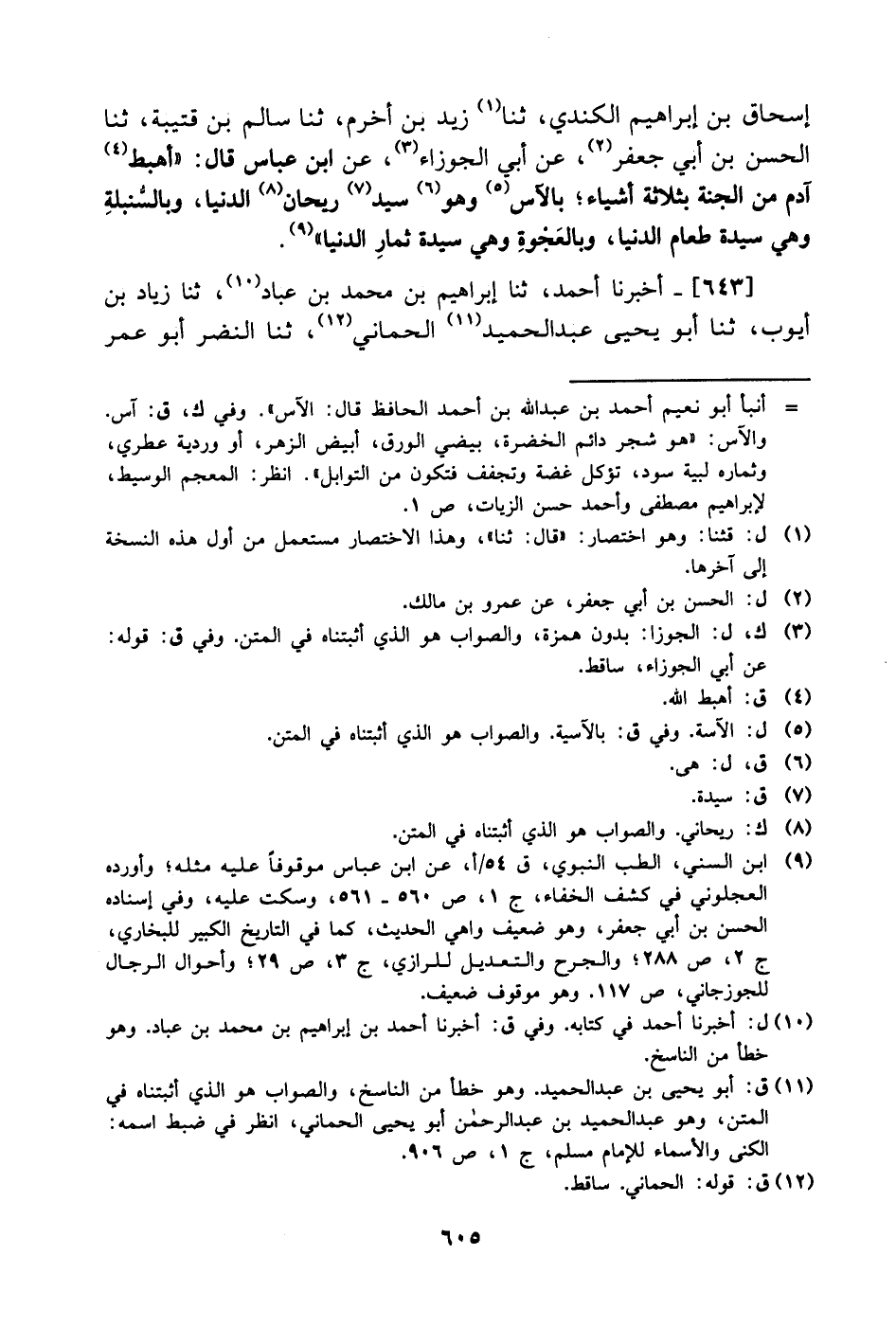 643- أخبرنا أحمد، حَدَّثَنا إبراهيم بن محمد بن عباد، حَدَّثَنا زياد بن أيوب، حَدَّثَنا أبو يحيى عبد الحميد الحماني، حَدَّثَنا النضر أبو عُمَر -[606]- الخزاز، عَن عِكرمة، عَن ابن عباس قال: أول غرس وضعه نوح في الأرض حين هبط من السفينة الآس.