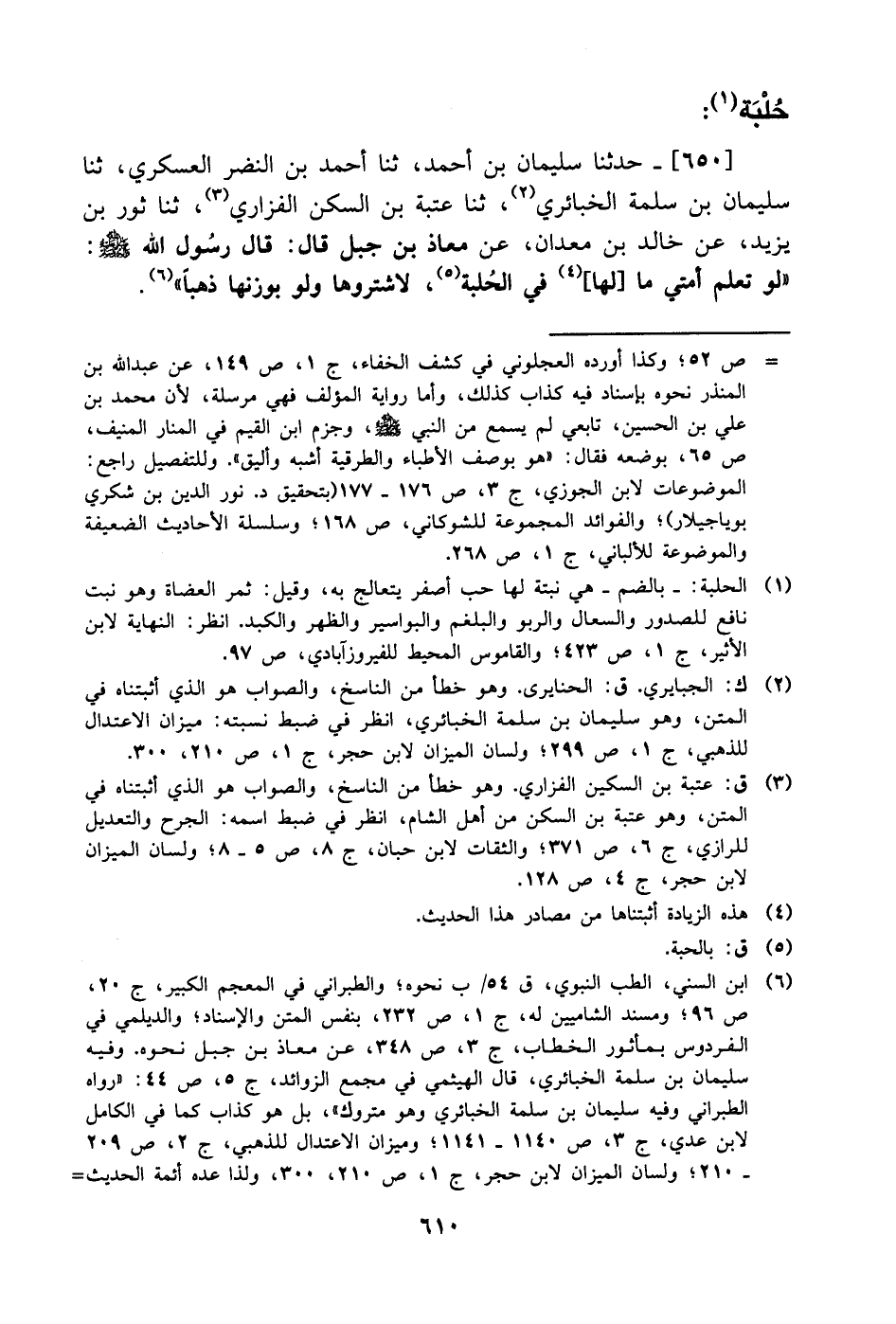 650- حَدَّثَنا سليمان بن أحمد، حَدَّثَنا أحمد بن النضر العسكري، حَدَّثَنا سليمان بن سلمة الخبائري، حَدَّثَنا عتبة بن السكن الفزاري، حَدَّثَنا ثور بن يزيد، عَن خالد بن معدان، عَن معاذ بن جبل، قال: قال رسول الله صَلَّى الله عَليْهِ وَسلَّم: لو تعلم أمتي ما لها في الحلبة لاشتروها ولو بوزنها ذهبا.