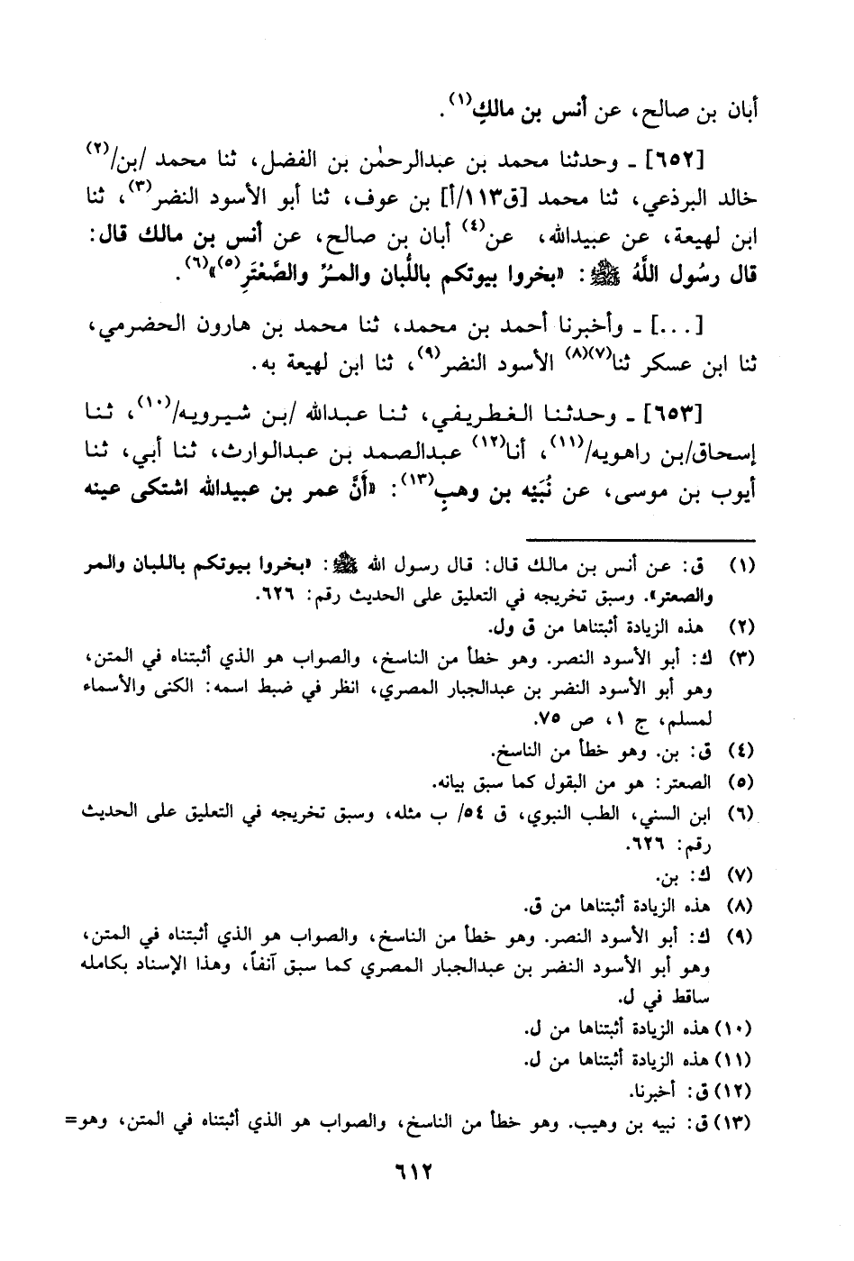 653- وَحَدَّثنا الغطريفي، حَدَّثَنا عبد الله بن شيرويه، حَدَّثَنا إسحاق بن راهويه، أَخْبَرنا عبد الصمد بن عبد الوارث، حَدَّثَنا أبي، حَدَّثَنا أيوب بن موسى، عَن نبيه بن وهب: أن عُمَر بن عبيد الله اشتكى عينه -[613]- وهو محرم فنهاه أبان بن عثمان فأمره أن يضمدها بالصبر والمر وَحَدَّثنا عثمان، عَن النبي صَلَّى الله عَليْهِ وَسلَّم بمثل ذلك أنه كان يقوله.