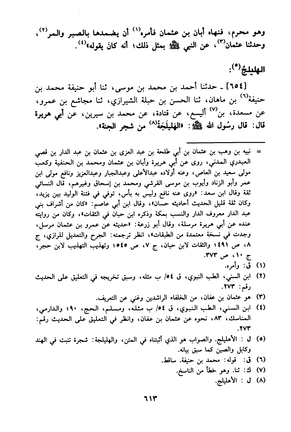 654- حَدَّثَنا أحمد بن محمد بن موسى، حَدَّثَنا أبو خليفة محمد بن حنيفة بن ماهان، حَدَّثَنا الحسن بن حبلة الشيرازي، حَدَّثَنا مجاشع بن عَمْرو، عَن مسعدة بن اليسع، عَن قتادة، عَن محمد بن سيرين، عَن أَبِي هُرَيرة، قال: قال رسول الله صَلَّى الله عَليْهِ وَسلَّم: الهليلجة من شجر الجنة.