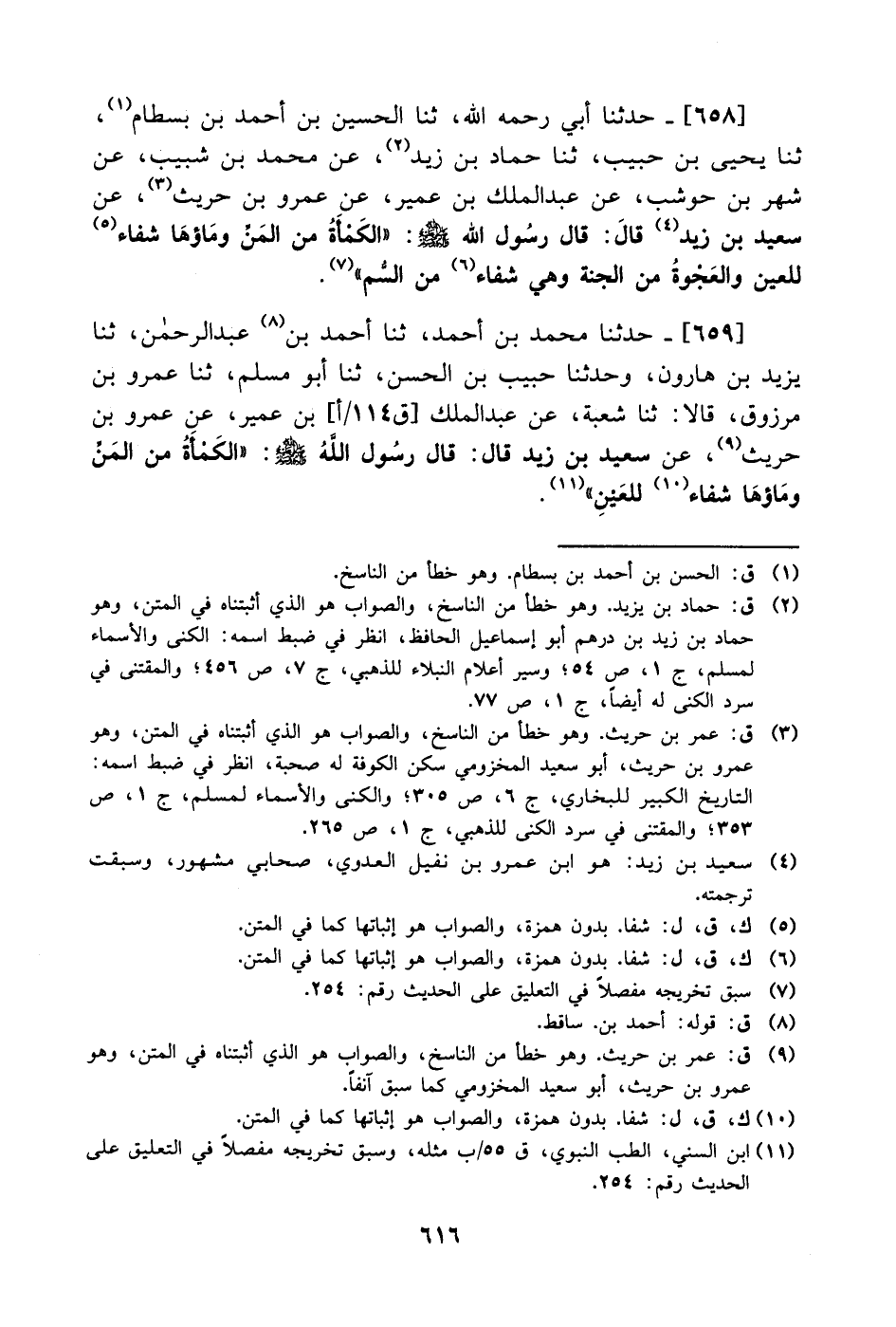 659- حَدَّثَنا محمد بن أحمد، حَدَّثَنا أحمد بن عبد الرحمن، حَدَّثَنا يزيد بن هارون وَحَدَّثنا حبيب بن الحسن، حَدَّثَنا أبو مسلم، حَدَّثَنا عَمْرو بن مرزوق قالا:، حَدَّثَنا شعبة، عَن عَبد الملك بن عمير، عَن عَمْرو بن حريث، عَن سعيد بن زيد، قال: قال رسول الله صَلَّى الله عَليْهِ وَسلَّم: الكمأة من المن وماؤها شفاء للعين.
