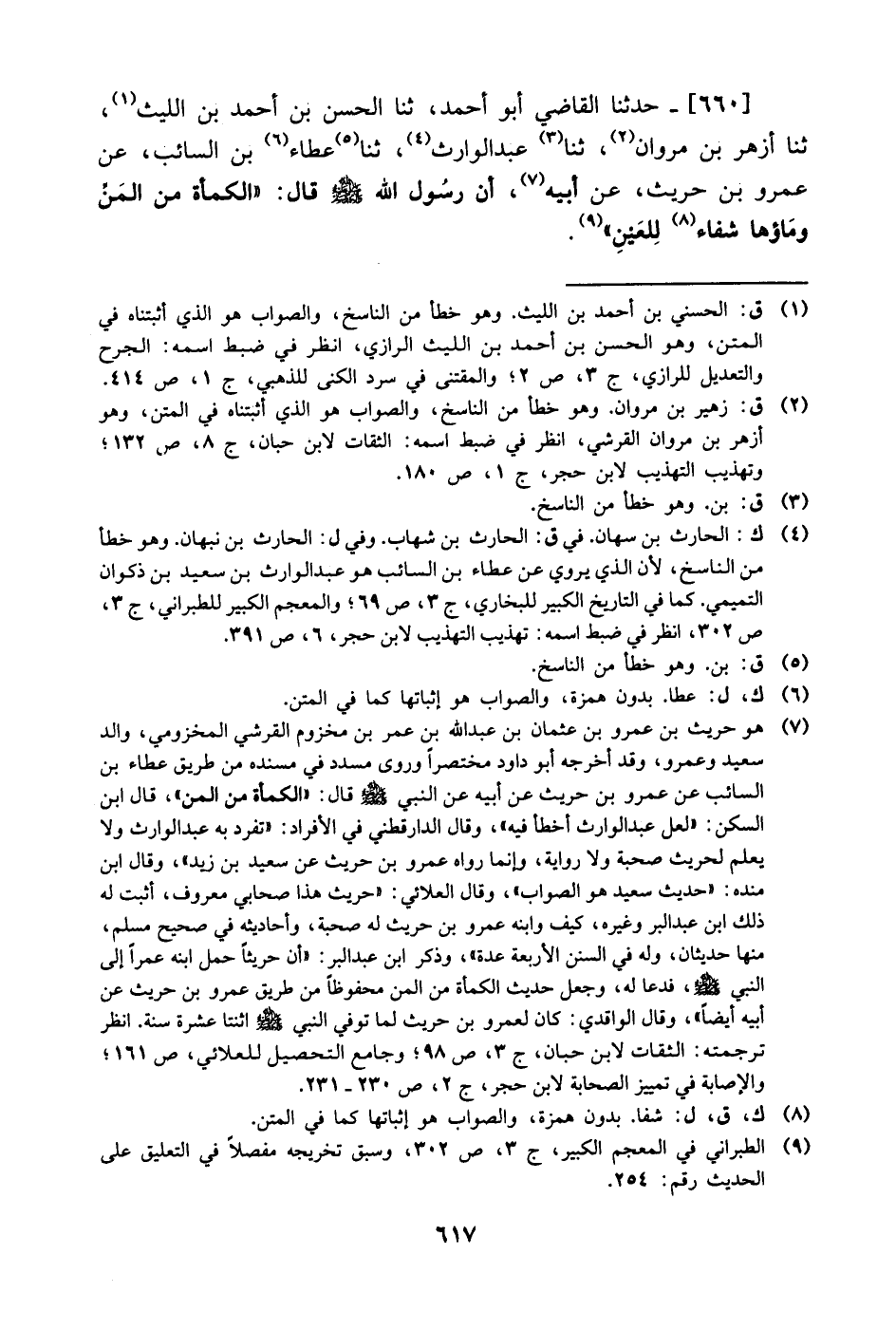 660- حَدَّثَنا القاضي أبو أحمد، حَدَّثَنا الحسن بن أحمد بن الليث، حَدَّثَنا أزهر بن مروان، حَدَّثَنا عبد الوارث، حَدَّثَنا عطاء بن السائب، عَن عَمْرو بن حريث، عَن أبيه أن رسول الله صَلَّى الله عَليْهِ وَسلَّم قال: الكمأة من المن وماؤها شفاء للعين.