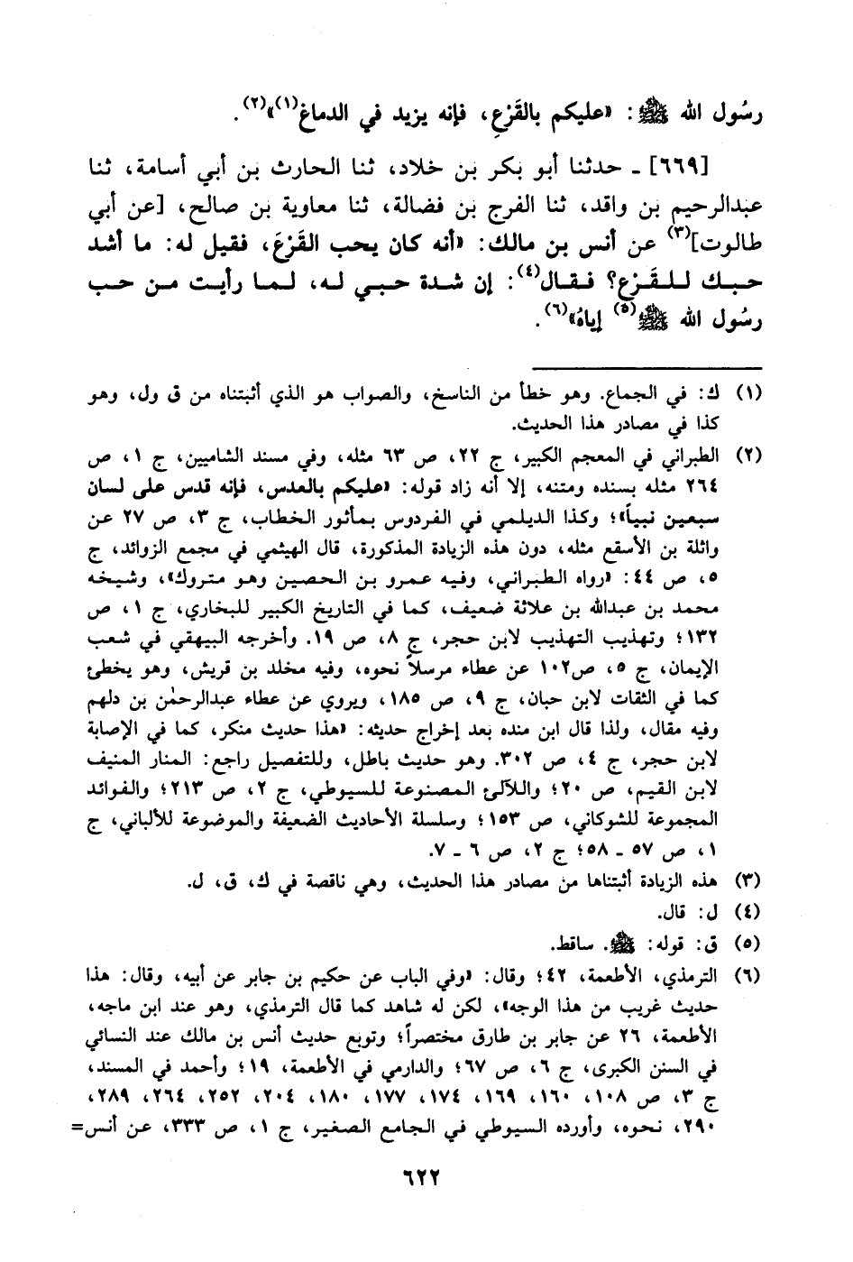 669- حَدَّثَنا أبو بكر بن خلاد، حَدَّثَنا الحارث بن أبي أسامة، حَدَّثَنا عبد الرحيم بن واقد، حَدَّثَنا الفرج بن فضالة، حَدَّثَنا معاوية بن صالح، عَن أَبِي طالوت، عَن أنس بن مالك: أنه كان يحب القرع فقيل له: ما أشد حبك للقرع؟ فقال: إن شدة حبي له لما رأيت من حب رسول الله صَلَّى الله عَليْهِ وَسلَّم إياه.